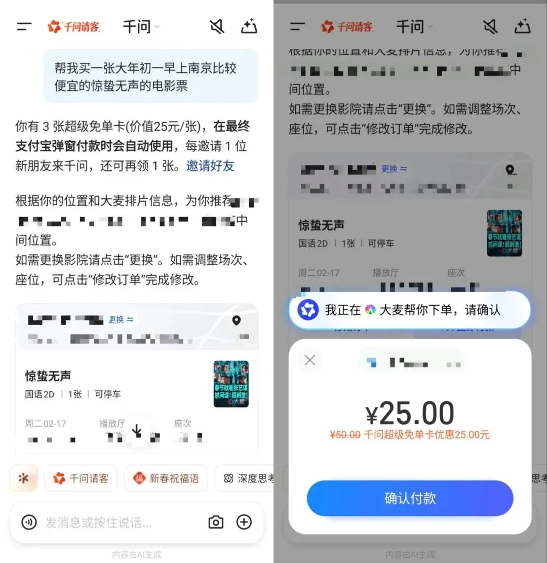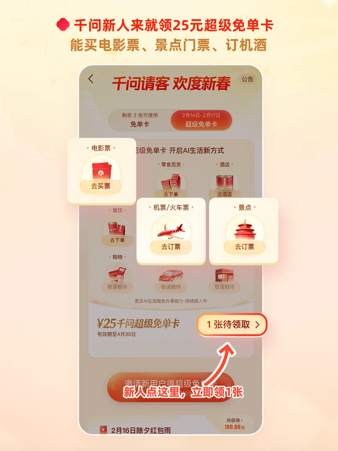 今年春节只做⼀件事——领25元超级免单卡,⽤AI吃喝玩乐!看电影、买年货、订⻔票或机票......⽤千问免单卡玩转南京。