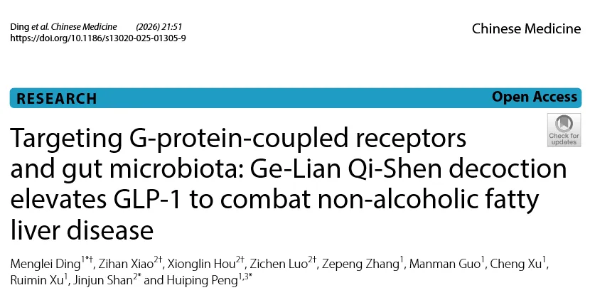 为探究葛连启神汤(GQD)改善非酒精性脂肪肝(NAFLD)的潜在机制,研究先构建高脂饮食(HFD)诱导的小鼠 NAFLD 模型,经不同剂量 GQD 干预后检测肝脂、糖代谢等核心指标明确其体内改善效应,再通过 NCI-H716 细胞实验结合抑制剂、siRNA 验证 GQD 对 GLP-1 分泌的调控及 G 蛋白偶联受体(苦味受体、TGR5)的介导作用,利用 UPLC-MS/MS 分析 GQD 化学成分与回肠分布并筛选活性成分,同时通过 16S rDNA 测序、代谢组学解析其对肠道菌群及代谢物的影响,最后经粪菌移植(FMT)验证肠道菌群的介导作用;研究证实 GQD 呈剂量依赖性改善小鼠 NAFLD 相关症状,其可通过生物碱、蒽醌类、三萜类成分激活肠道苦味受体和 TGR5 直接促进 GLP-1 分泌,还能调节肠道菌群增加短链脂肪酸含量、上调结肠 Gcg 表达以持续升高 GLP-1,肠道菌群可部分介导其抗 NAFLD 效应,双重途径升高的 GLP-1 最终缓解 NAFLD。