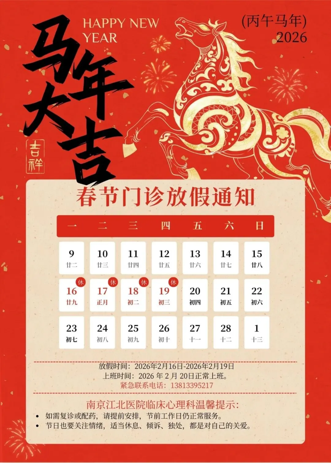 为了让每一位需要支持的朋友在春节期间依然能找到倾诉的出口,南京江北医院临床心理科将坚守岗位,做您心灵最温暖的“守岁人”。