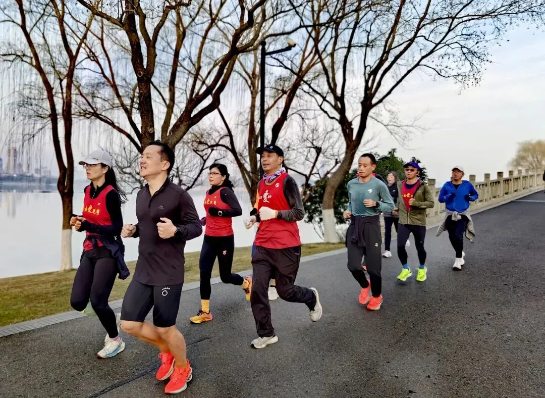 一路相伴,从星光点点跑到天际微亮,薄雾轻笼湖水,朝霞漫染城墙。当黎明铺满湖面,队伍迎着晨光奔跑,用热爱与坚持,唤醒整座金陵城。