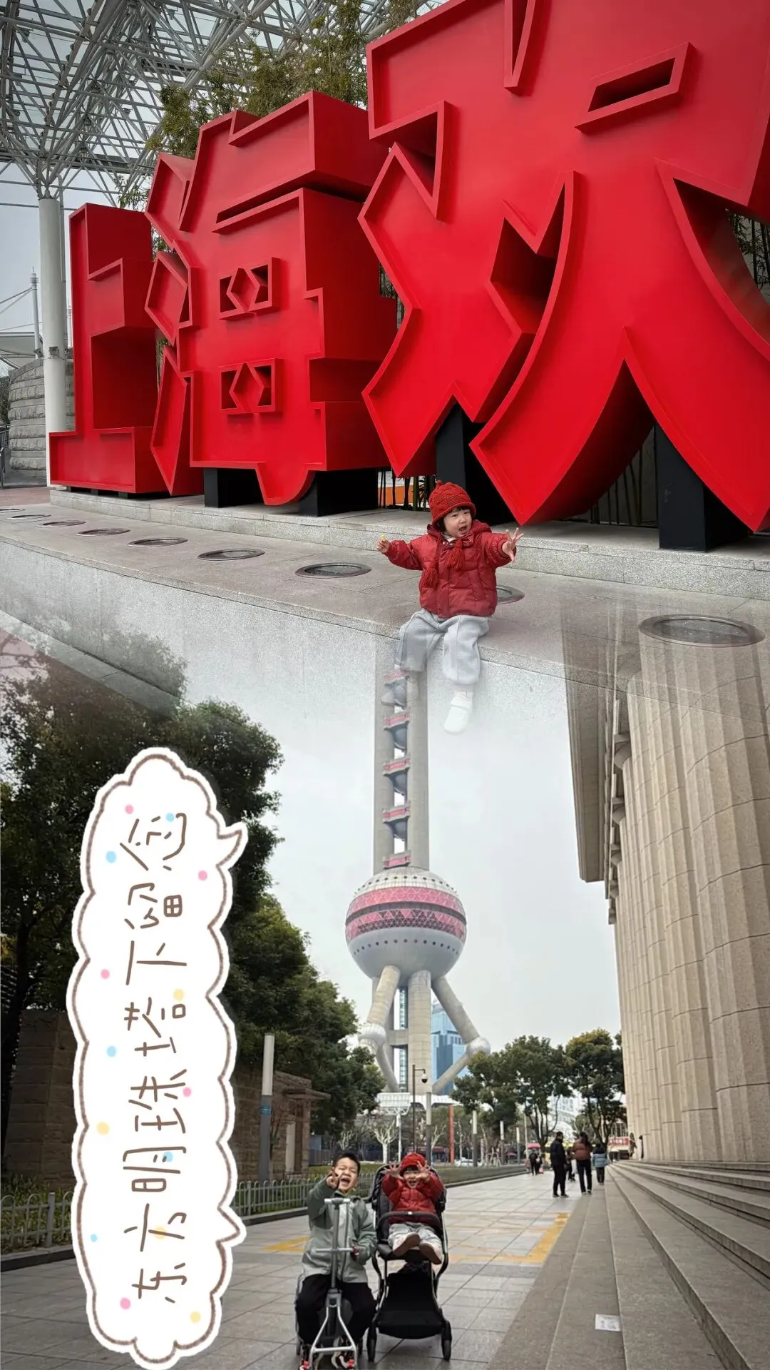 我们一出地铁站,就先在东方明珠底下打卡拍了标准游客照📸,娃看到巨东方明珠超激动!紧接着凭旋转餐厅预约走绿色通道坐电梯上楼,幸福感爆棚!
