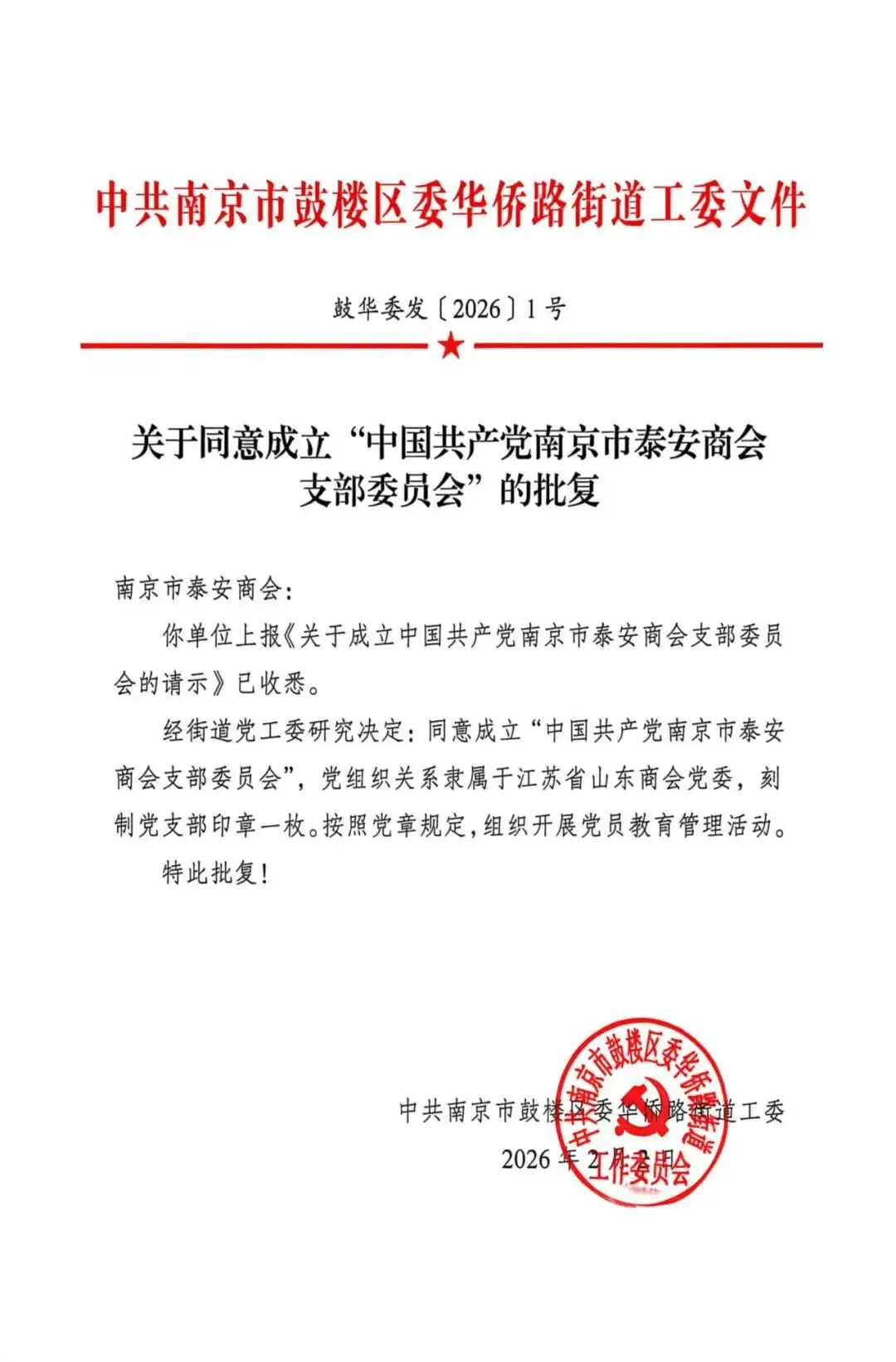 在2026年新春佳节到来之际,中共南京市鼓楼区委华侨路街道工委正式下发《关于同意成立“中国共产党南京市泰安商会支部委员会”的批复》(鼓华委发〔2026〕1号),同意成立中国共产党南京市泰安商会支部委员会。这标志着南京市泰安商会在党建引领、规范发展的道路上迈出了坚实而重要的一步。