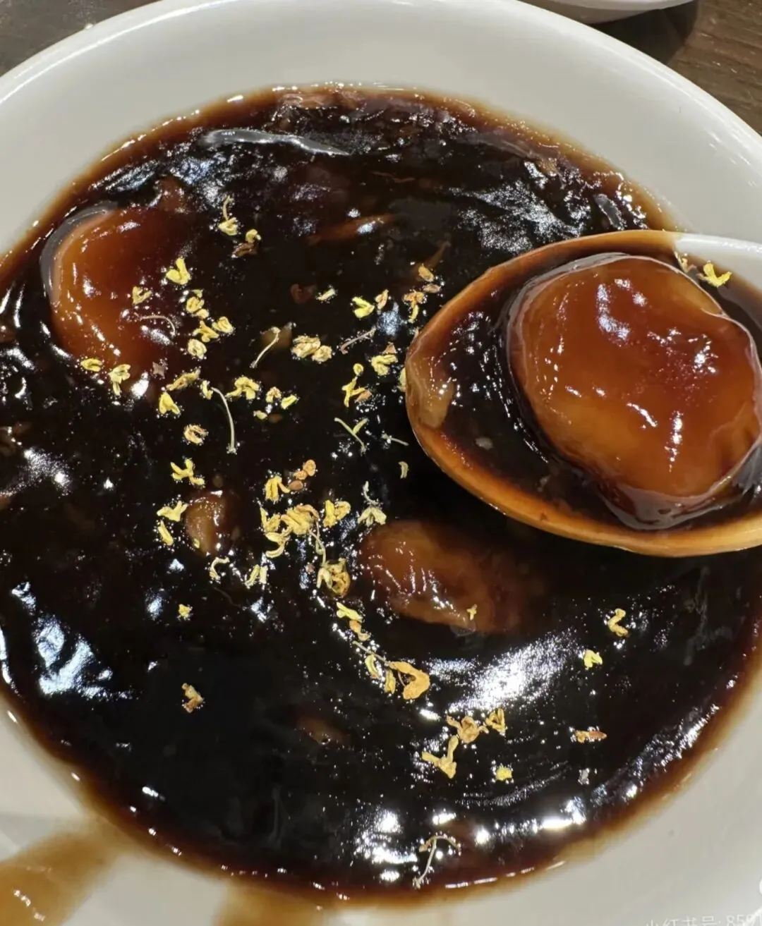 元宵是小小的糯叽叽的丸子,QQ弹弹的,不粘牙,裹在稠稠的红豆汤里,再淋上一勺桂花蜜,香得不行。