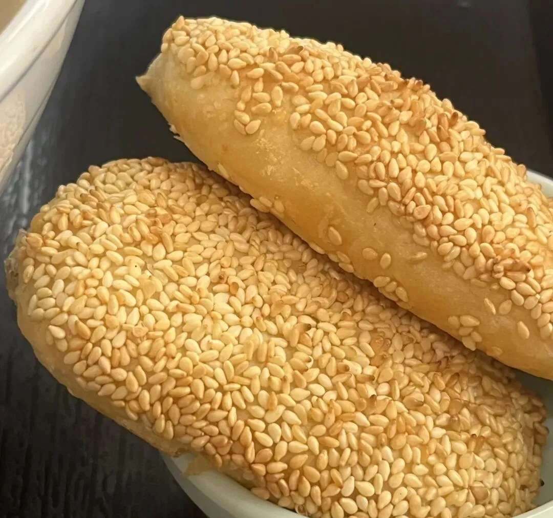 我每次买刚出锅的鸭油酥烧饼,都要站在摊儿旁边吃完,根本不敢拿着走路,因为一走路就掉一身渣,酥到离谱。烧饼分咸口和甜口的,我更爱咸口的,上面撒满了白芝麻,鸭油的香混着芝麻的香,刚烤出来的时候,香得人走不动道。