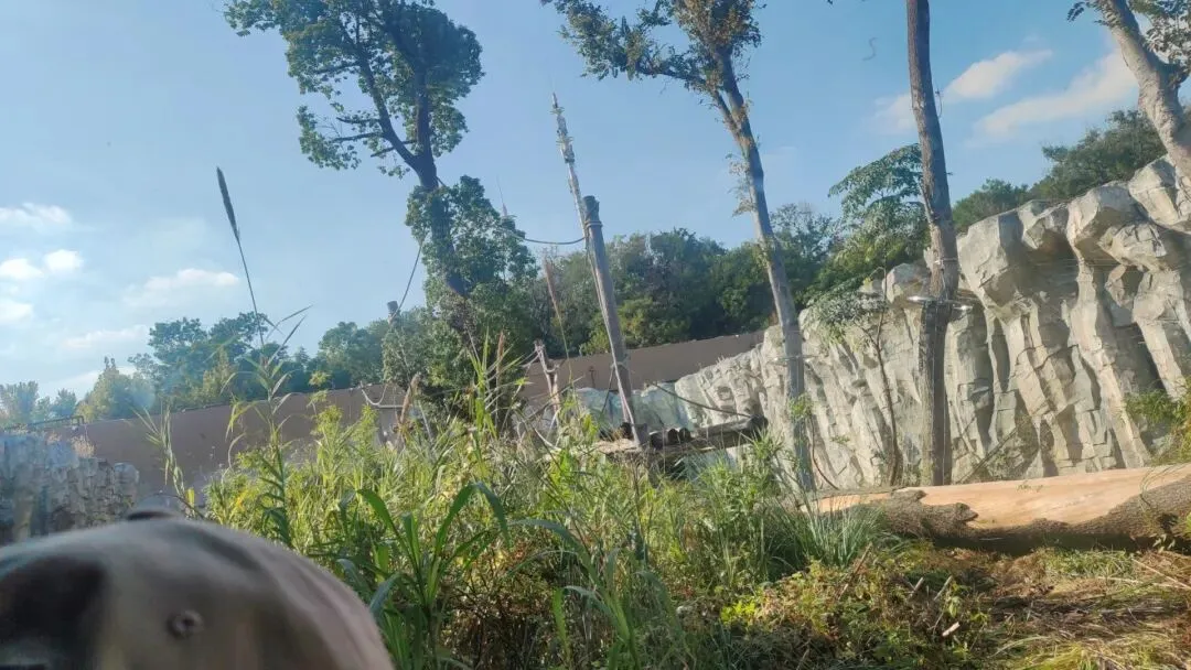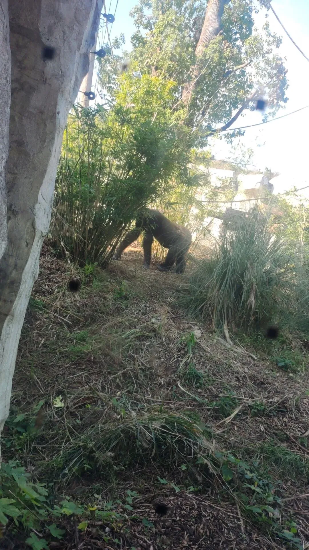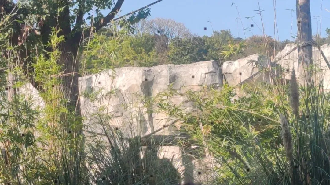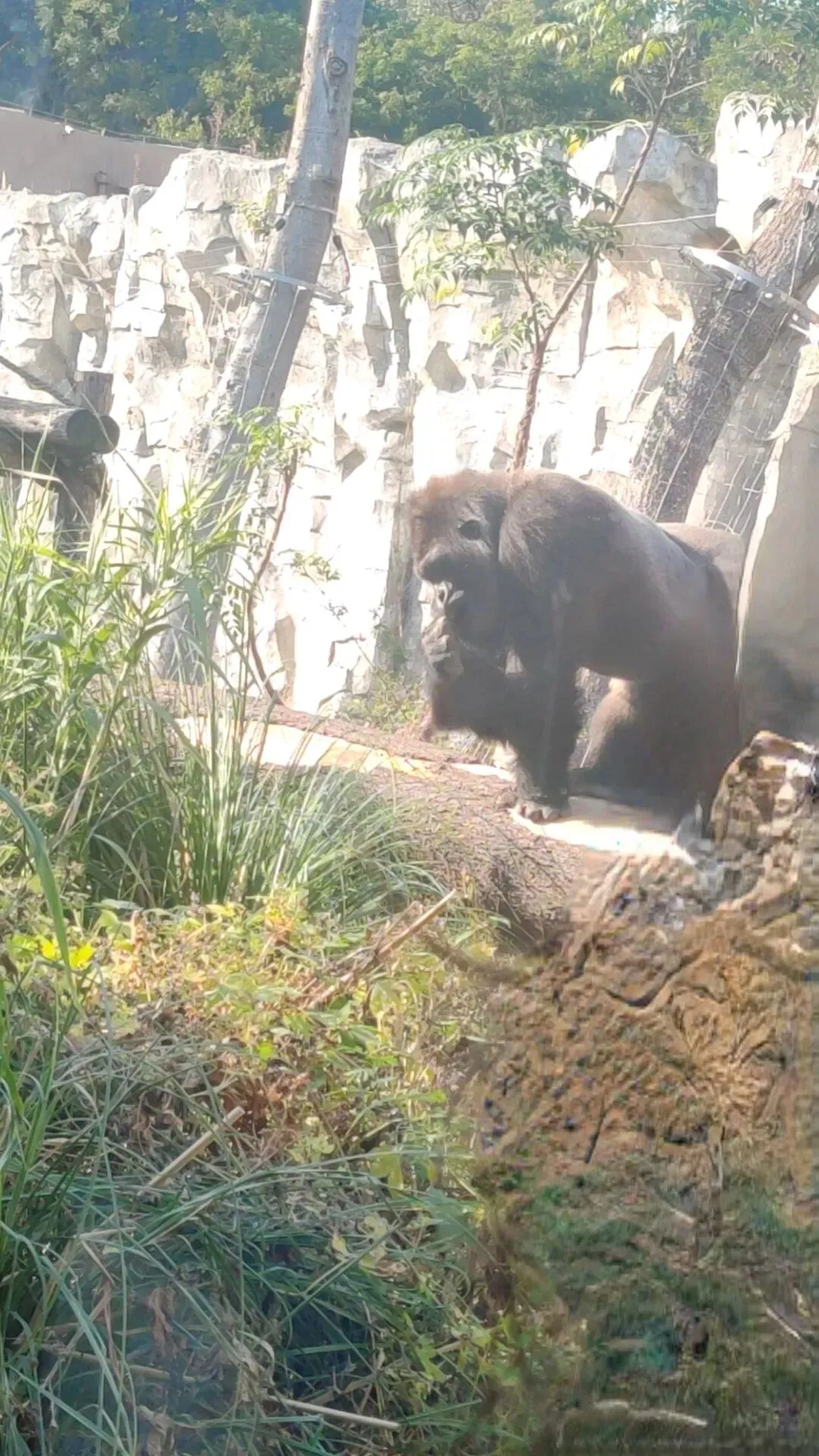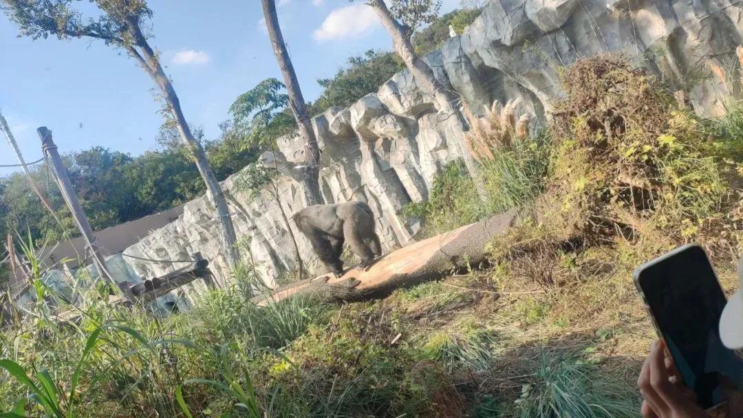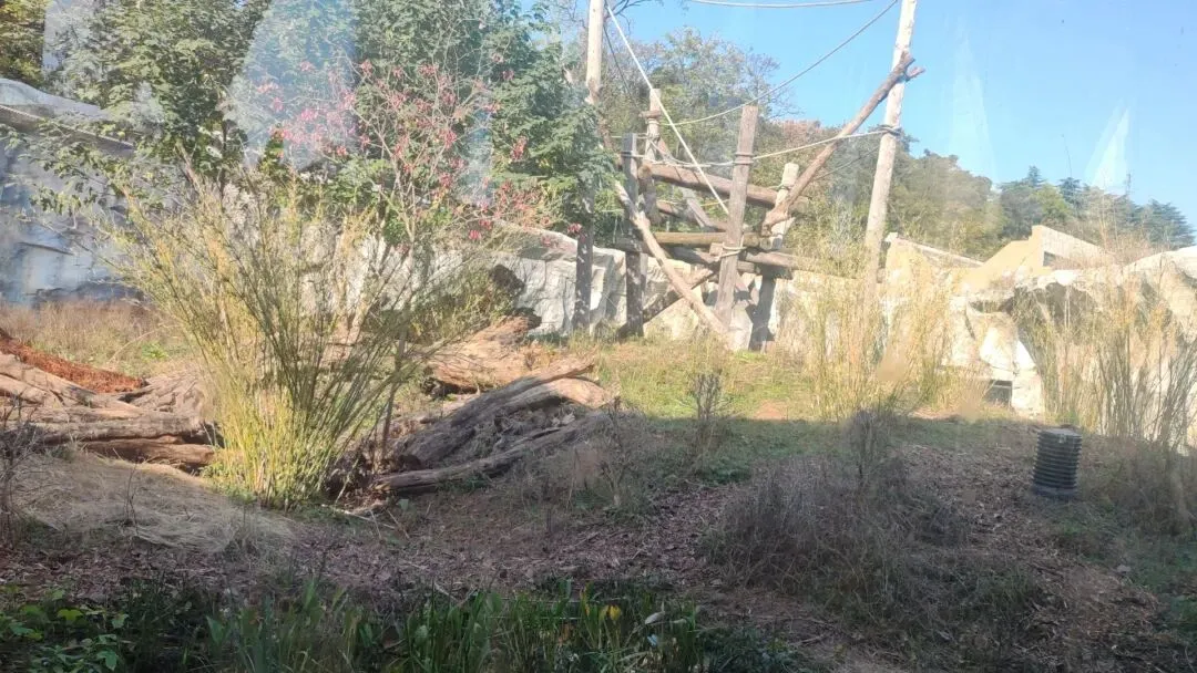 也有分散在不同位置的茂密植被以及树木。可供大猩猩随时将庞大的身形有效隐匿在其中或后方,使动物不会因为长时间无死角暴露在游客视线中而感到压力,在天气炎热时也能获取这些植物产生的充足自然遮阴效果,动物日常可根据自身需求随时切换不同的活动环境,有效满足了动物各种日常需求。