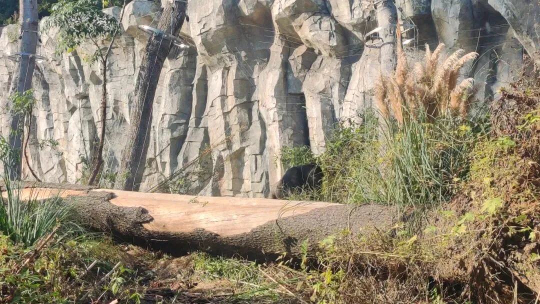 地面有一株粗大坚实且很长的倒伏树干,有效提升了地面起伏度与动物活动空间立体化,同时树干表面也是跌宕起伏,大猩猩们在上方栖息与爬行时体表将会获得丰富的自然触感。