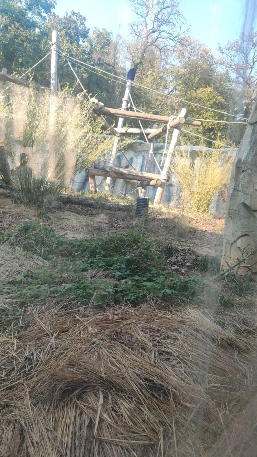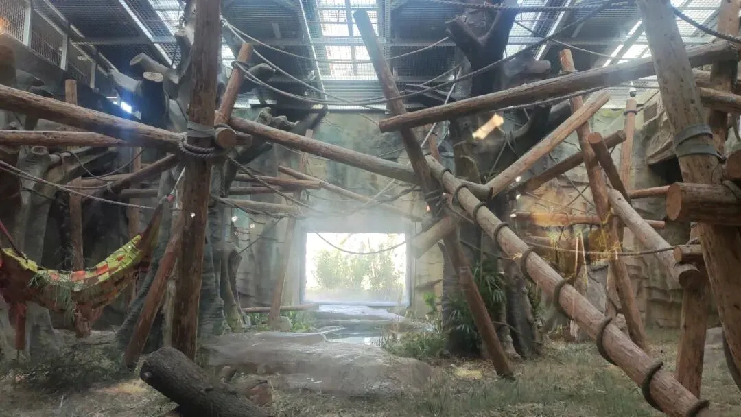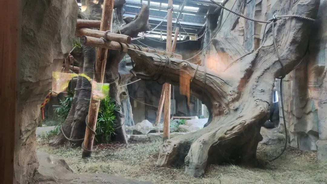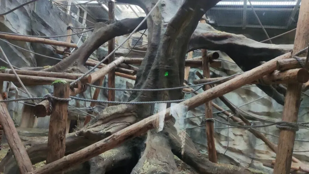 一处倾斜形态的栖架正对着游客玻璃面,游客们将有机率可以近距离迎面观察大猩猩们十分敏捷的从栖架上方攀爬到地面的过程,又是个十分震撼的画面,我们还可以看到栖架表面还缠绕着数层粗糙且坚固的绳索,模拟了野外环境中树木表面缠绕的藤蔓,便于大猩猩们日常攀爬的同时让它们在攀爬过程中能够获得更加丰富的体表触感 是个经济实惠,一举两得的日常丰容措施。