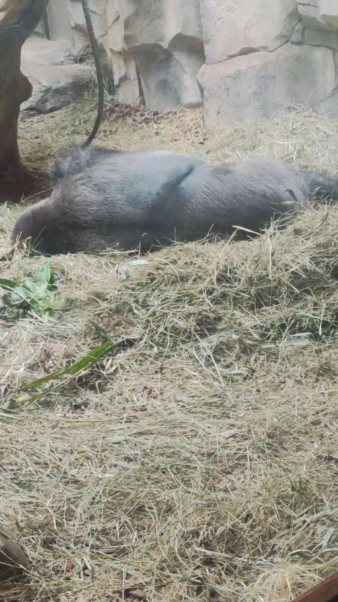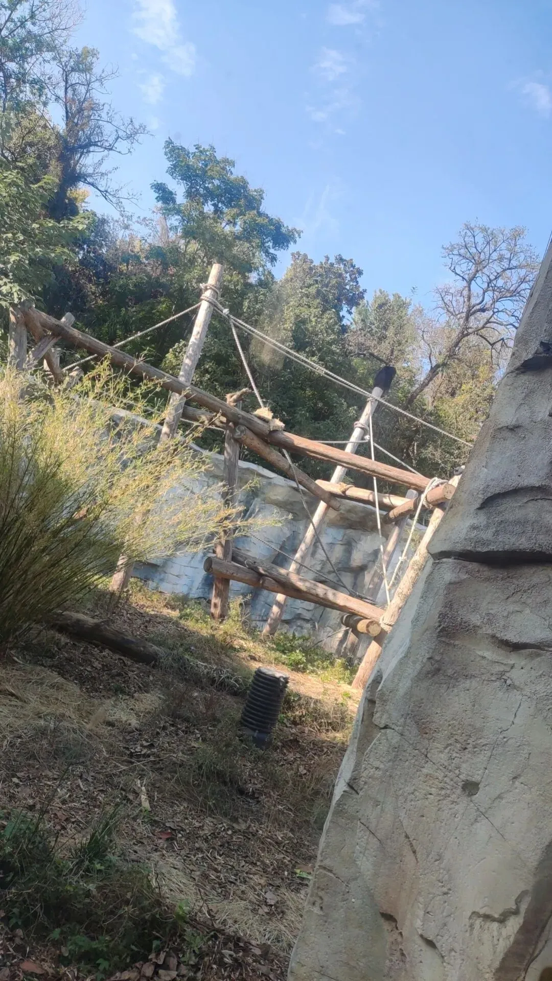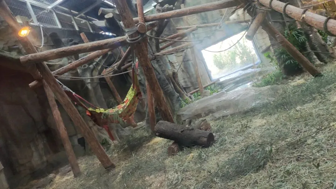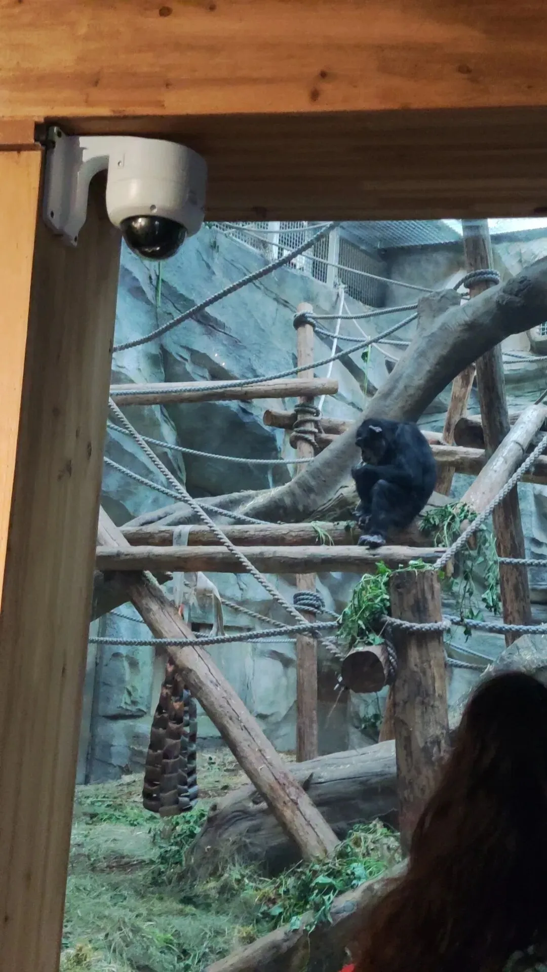 一处倾斜形态的栖架正对着游客玻璃面,游客们将有机率可以近距离迎面观察大猩猩们十分敏捷的从栖架上方攀爬到地面的过程,又是个十分震撼的画面,我们还可以看到栖架表面还缠绕着数层粗糙且坚固的绳索,模拟了野外环境中树木表面缠绕的藤蔓,便于大猩猩们日常攀爬的同时让它们在攀爬过程中能够获得更加丰富的体表触感 是个经济实惠,一举两得的日常丰容措施。