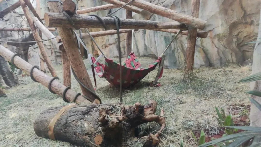 一处栖架悬挂着一张消防水带吊床,底部直接挨着地面,大猩猩们在吊床中休息时将可以感受到吊床材质与地面共同产生的别样体表触感。并且能够展现出资源循环利用的主题。