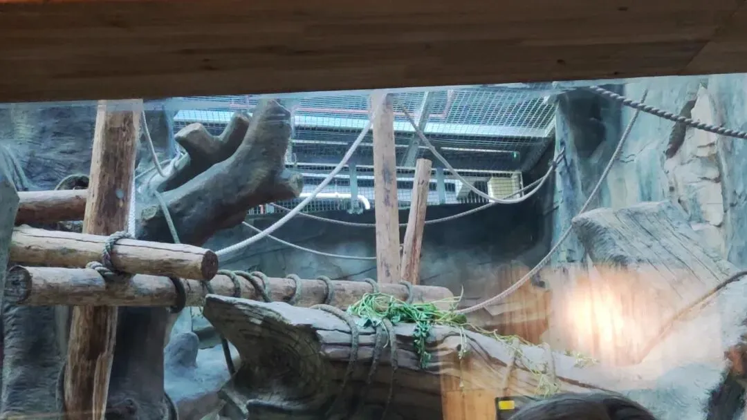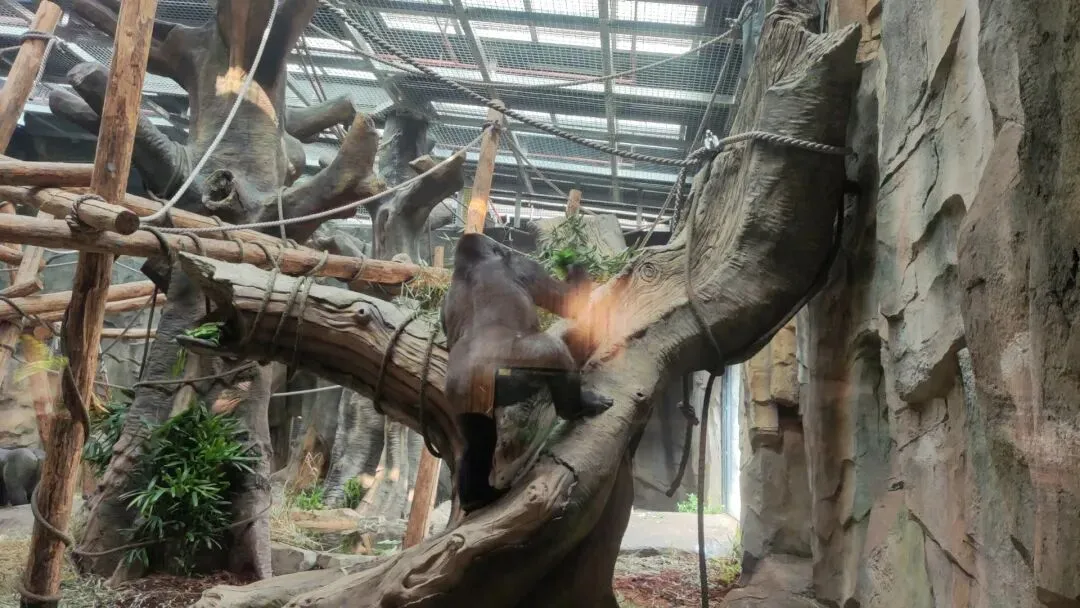 游客既能眺望在展区深处栖架上辗转腾挪的黑猩猩,也有机率可以欣赏到在接近玻璃面的倾斜栖架上敏捷爬行的黑猩猩,收获极为丰富的视觉体验感。