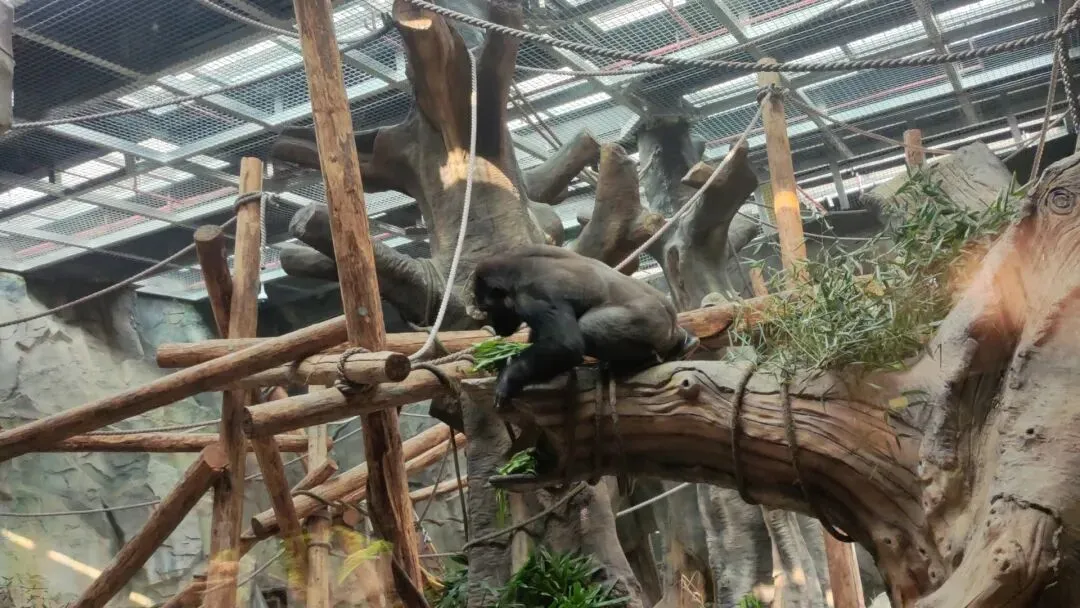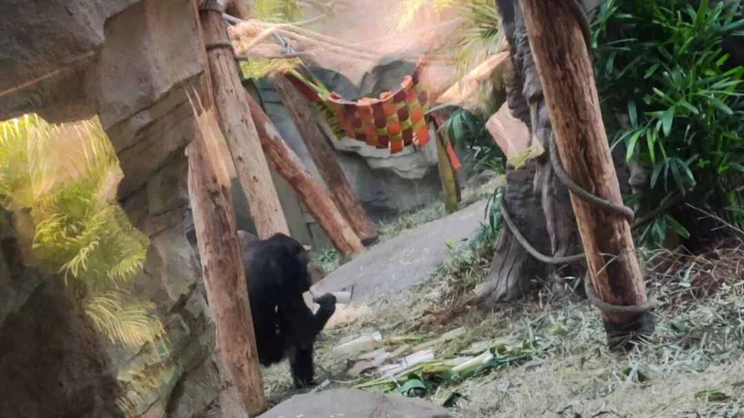 一些食物被塞和缠绕在几株树干堆成的空间中,一只大猩猩正在缓缓的将食物取出吃掉,这样缓慢的取食过程在有效丰富它们日常生活的同时也极好的提升了游客的观感。