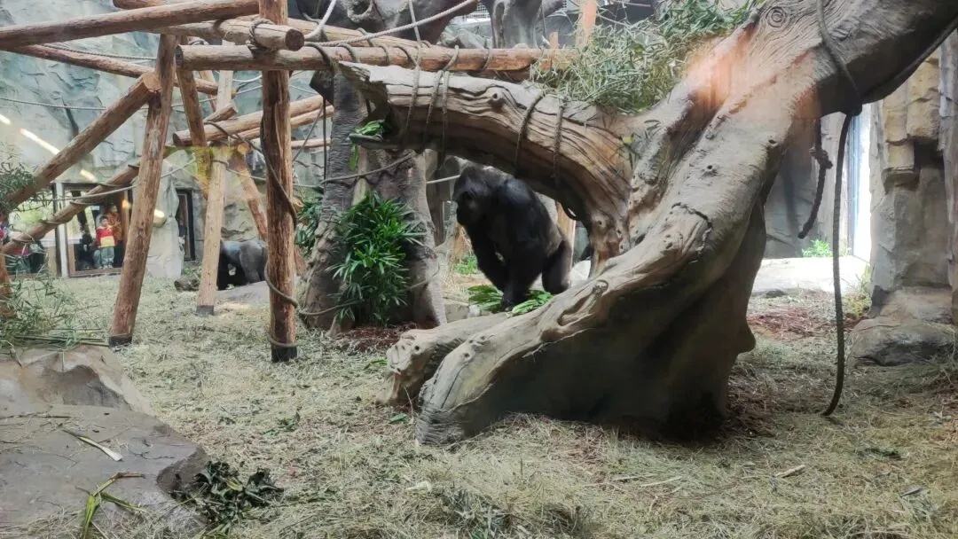 同时游客也有机率仰头一望突然发现大猩猩在高处平台上的场景,又一次获得相当不错的视觉体验感。