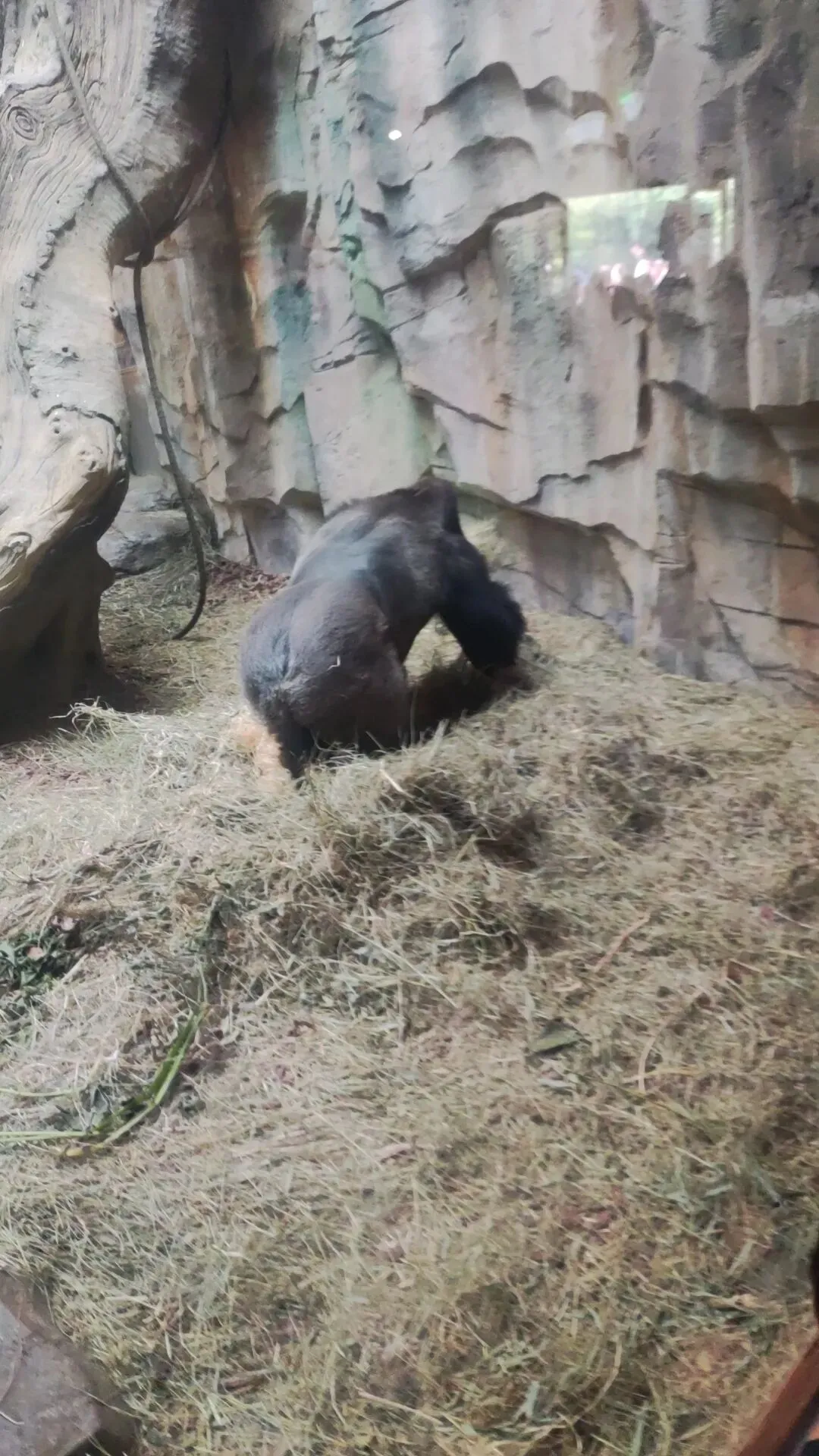 一只大猩猩正在翻找藏匿在垫料层中的食物,又是一个有趣的画面,再次令人看到了丰容措施的意义。