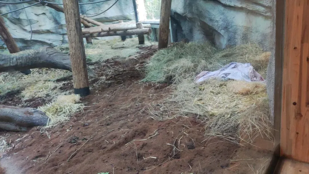 地面紧挨着玻璃面的一处位置有着一大块遮阴良好的区域,并且在地面铺设了厚实的干草垫料,动物在此处栖息活动时能够获得双重舒适体表触感,极大增加了动物在此处出现与游客近距离欣赏动物的机率,又是一个使游客与动物同时获得充足正面反馈的丰容措施。