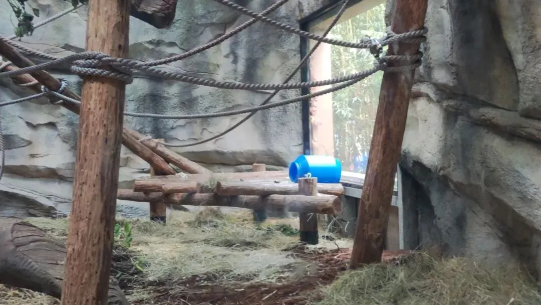 栖架上放置着一个藏食桶,这又是一个物美价廉的日常丰容措施,日常将食物藏匿其中可增加动物觅食过程,很好的增加了动物日常脑力与体力活动,展现出更加丰富的自然行为。