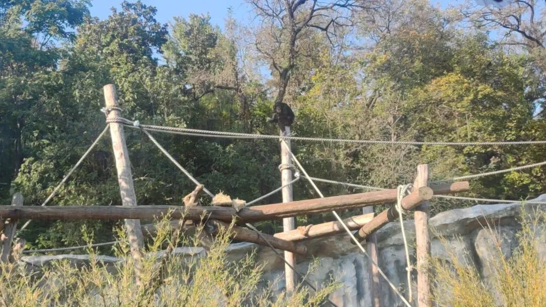 室外展区中央同样布置着一座巨大且结构复杂的栖架,整座栖架同样有着丰富的动物日常活动路径,并且也有数条极长且坚实的绳索连贯着栖架各个位置,黑猩猩可以尽情攀爬往返于栖架各个位置,游客将可以远远眺望其强悍的攀爬能力,如果身体下蹲的话,就仿佛是藏在茂密的植被后仰望远方高处攀爬的黑猩猩。