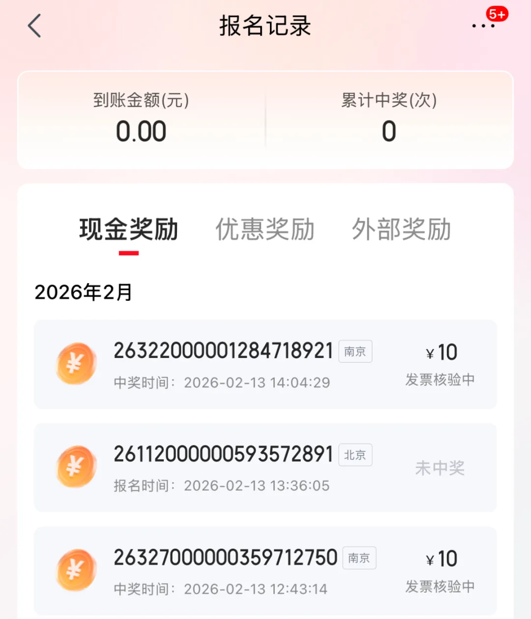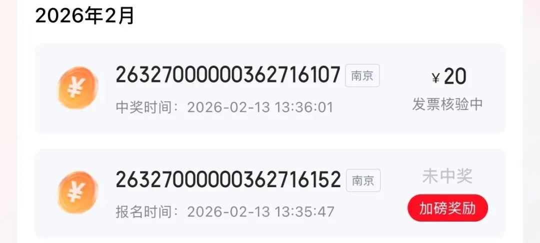 即时抽奖:🔹奖金发放:设10元、20元、50元三个等级;🔹中奖结果在发票上传页面实时显示,经发票真实性、“7天内是否红冲”等情况核验通过后发放奖金(发票上传8天后可查询到账)。