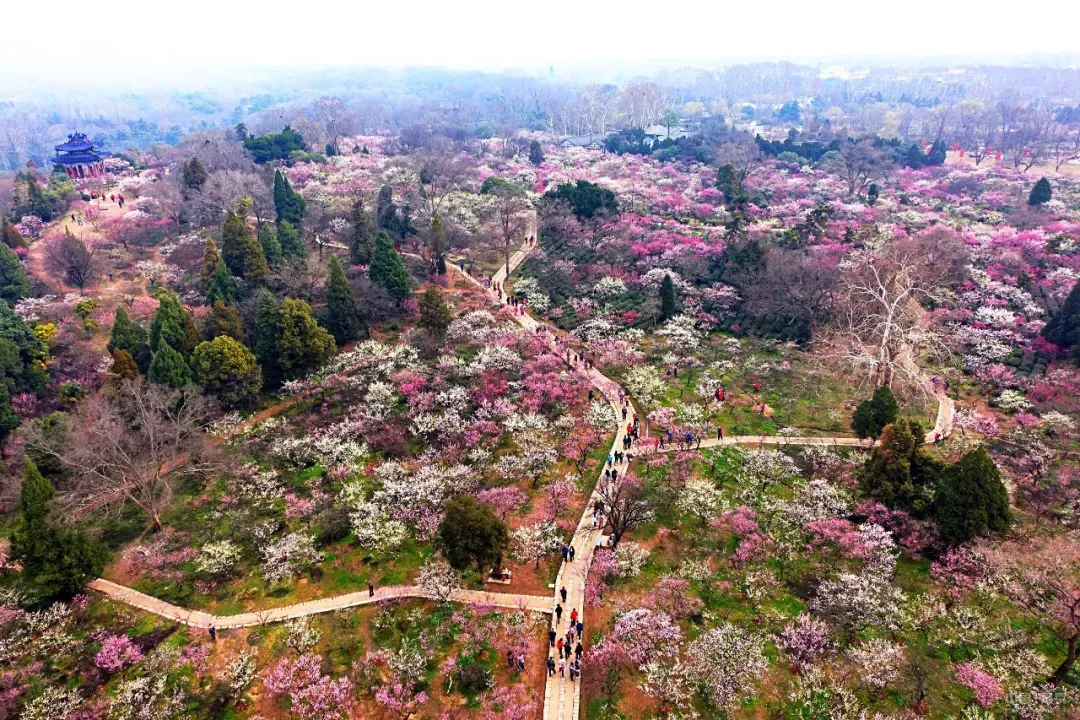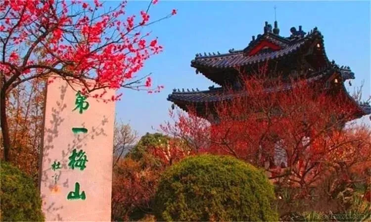 春初连日的升温、阴天、细雨,正适合梅花进入绽放期。无论从种植梅花的历史、规模、种类、数量,都堪称魁首.大量栽植了猩猩红、骨里红、照水、宫粉、跳枝、千叶红、长枝、胭脂、玉碟、送春等珍贵品种,其中“别角晚水”全国独此一株,尤为珍贵。春季梅花盛开之时,繁花满山,香飘数里。