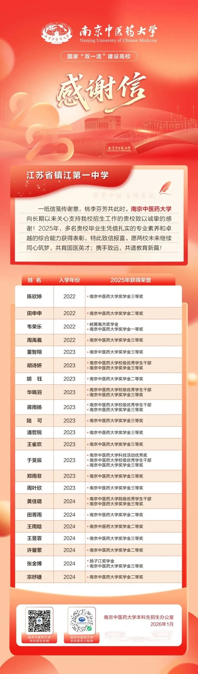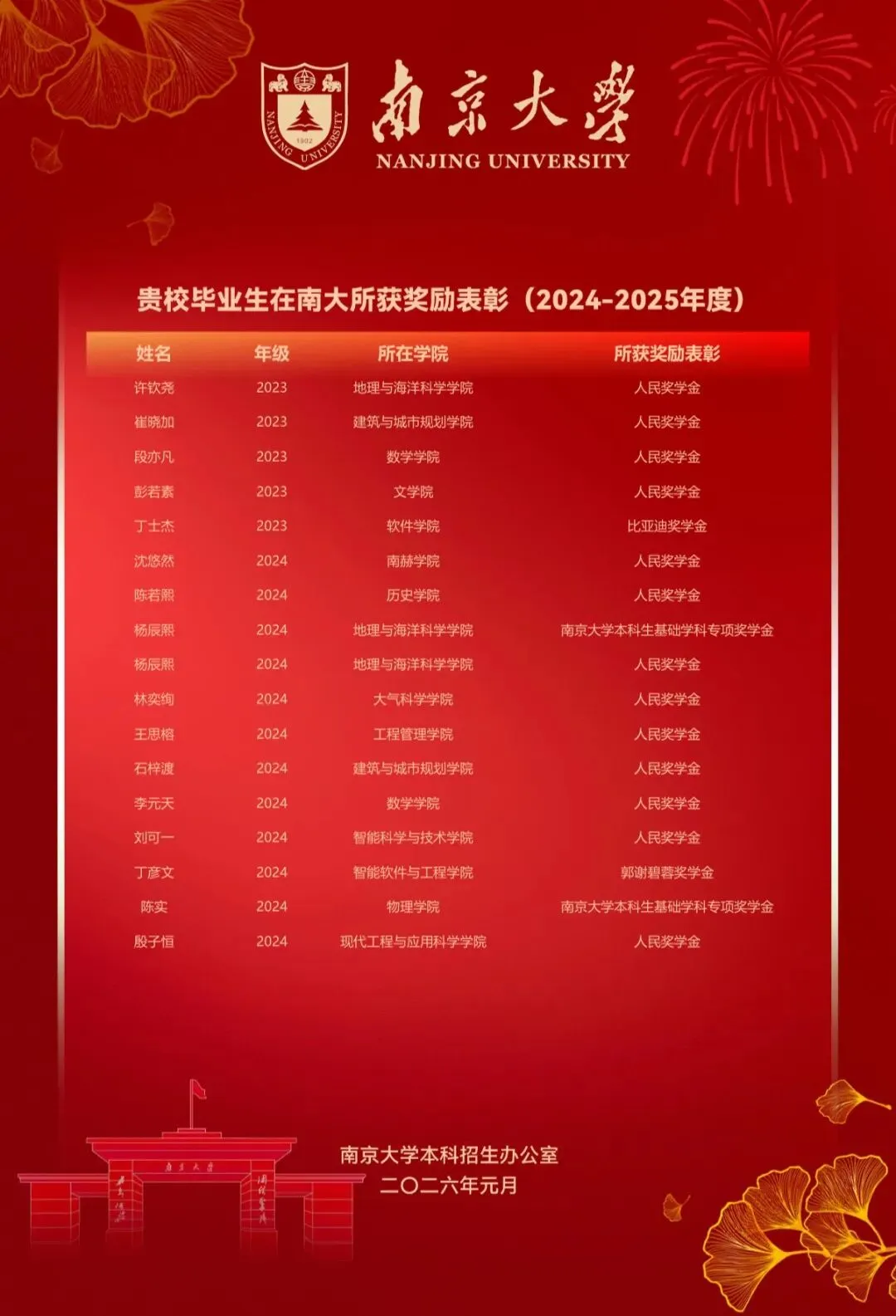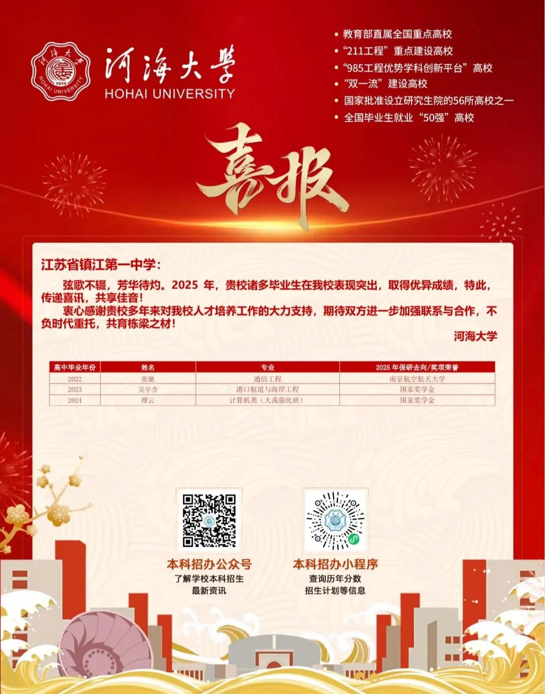 近日,南京大学、网络空间安全部队信息工程大学、西北工业大学、河海大学、哈尔滨工程大学、南京中医药大学等多所高校纷纷向我校发来喜报,热烈祝贺我校往届毕业生在大学期间勤学笃行、硕果累累,在更高学府续写青春荣光,展现了我校学子优秀的学风素养与精神风貌,为在校学弟学妹树立了榜样。