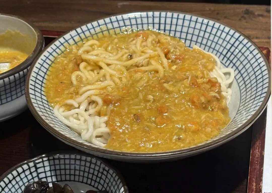 中午到达南京后,我和妈妈先去吃了碗蟹黄面。满满一碗蟹黄浇在面条上,搅拌搅拌,让每根面条都充分裹上金灿灿的蟹黄,顿时食欲大开。虽然现在不是吃蟹的时节,但一口下去仍觉得鲜香爽滑,丝毫不腥气。