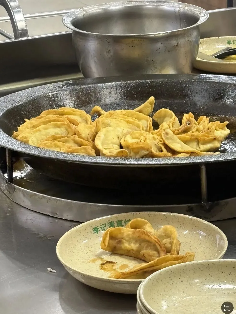 第二天一早,我们迎着飞雪来到李记清真馆吃早餐。这是一家老字号,牛肉锅贴是店里的招牌,其外皮金黄酥脆,内馅儿肉厚多汁,咬一口喷香喷香的!还点了份牛肉馄饨,有点儿咸。