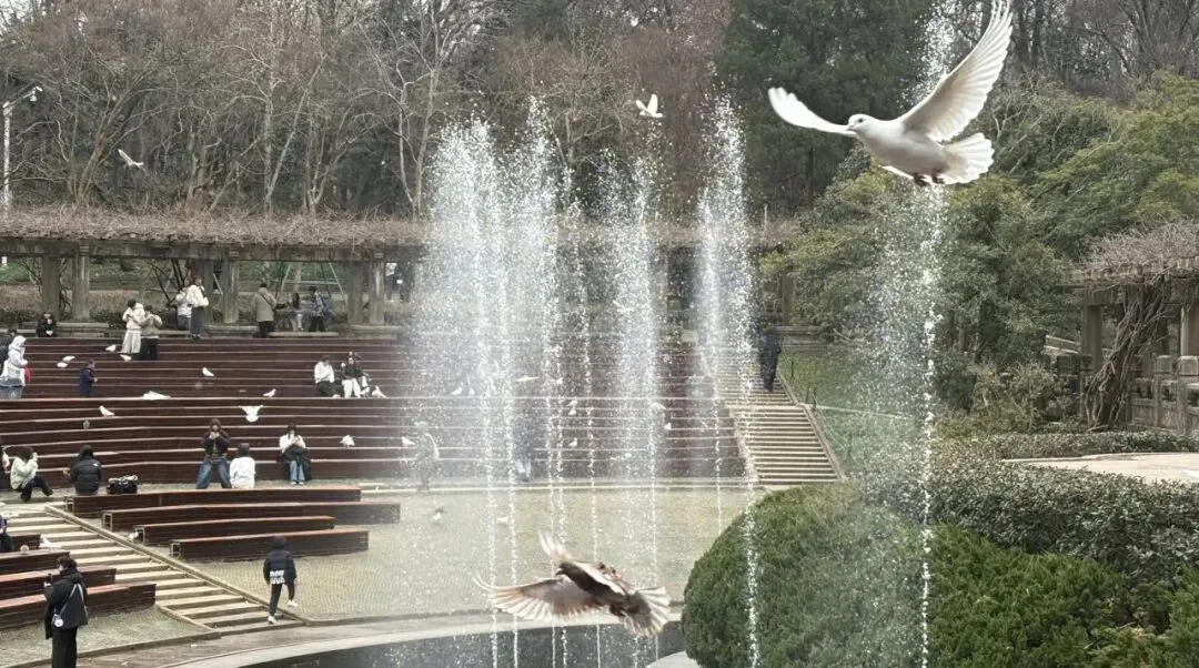 中山陵景区内有一处音乐台,是中西合璧的民国露天剧场。伴随着舒缓的音乐,喷泉有节奏地舞动起来,成群的白鸽在空中盘旋,好似电影中的场景。可以坐在台阶上喂喂鸽子,或者干脆懒洋洋地发会儿呆。