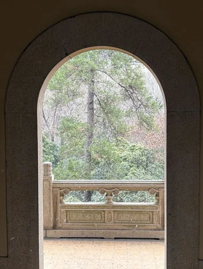 接着我们又坐观光车前往灵谷塔景区。景区内有一座灵谷塔,是国民革命阵亡将士纪念塔,共九层高,塔内有石阶可以攀爬到塔顶。每一层都有明亮漂亮的窗景,我们爬的时候刚好外面漫天飞雪,在苍松翠柏的映衬下宛若画中场景一般。