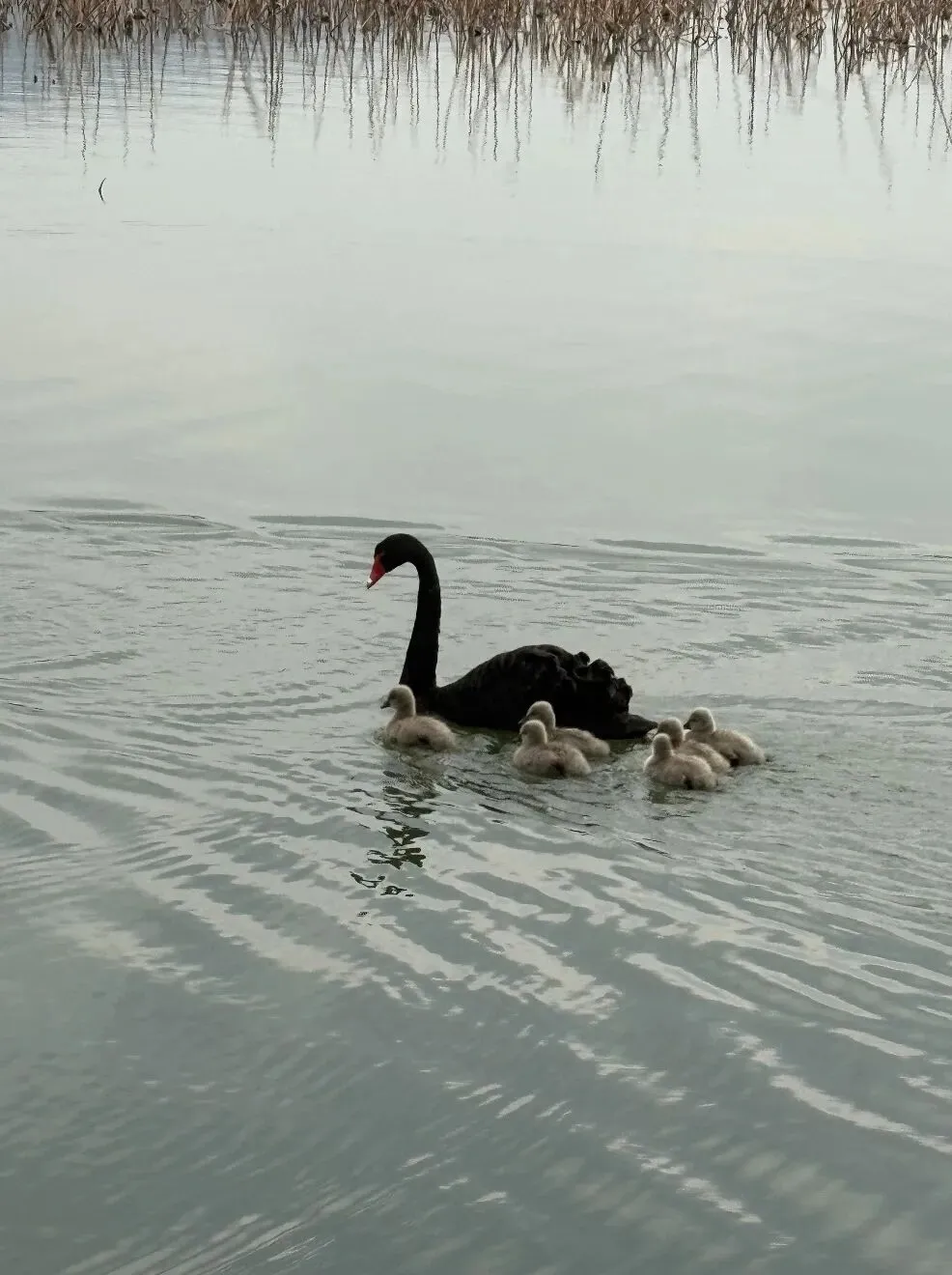 我们还看到了黑天鹅妈妈带着一群毛茸茸的鹅宝宝回家,超级可爱。