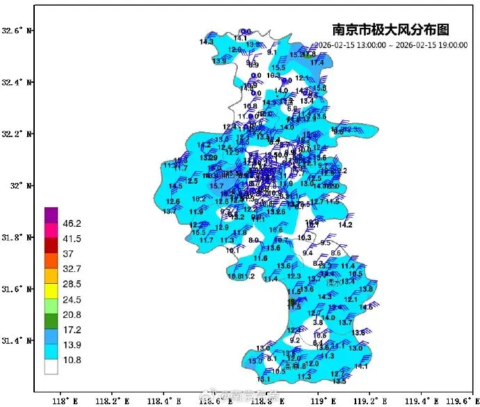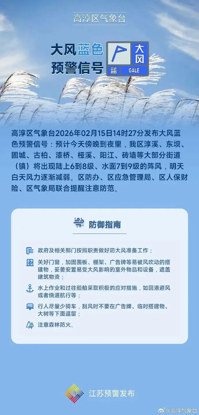 高淳区气象台2026年02月15日14时27分曾发布大风蓝色预警信号:预计今天傍晚到夜里,我区淳溪、东坝、固城、古柏、漆桥、桠溪、阳江、砖墙等大部分街道(镇)将出现陆上6到8级、水面7到9级的阵风。