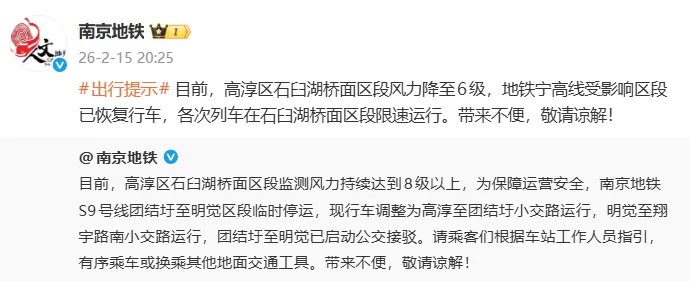 高淳区石臼湖桥面区段监测风力持续达到8级以上,为保障运营安全,南京地铁S9号线团结圩至明觉区段临时停运,现行车调整为高淳至团结圩小交路运行,明觉至翔宇路南小交路运行,团结圩至明觉已启动公交接驳。