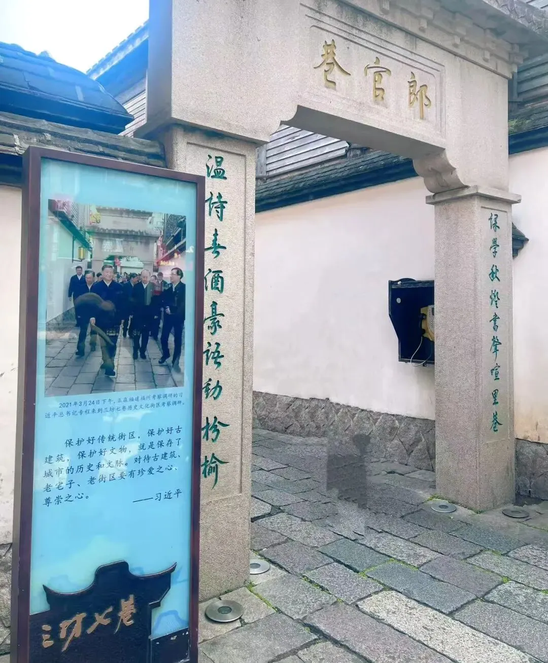 2021年3月24日,习近平总书记在福州三坊七巷考察时强调:“保护好传统街区,保护好古建筑,保护好文物,就是保存了城市的历史和文脉。对待古建筑、老宅子、老街区要有珍爱之心、尊崇之心。”