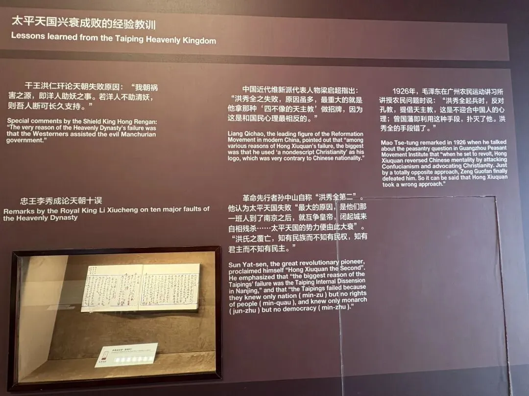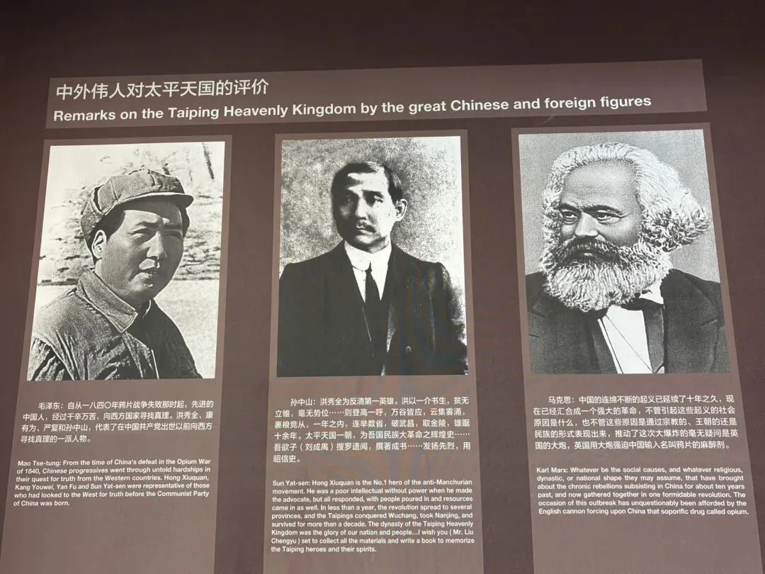 今天一大早起来就赶往太平天国博物馆,组织太平天国的人叫洪秀全,洪秀全出生在一个广东的农民家庭里。小的时候想长大以后在朝廷里当个公务员,可是一直从14岁考到36岁,一直没有考上。正巧当时的西方传教士正来广东做宣传,他接触到了一本宗教的小册子叫劝世良言。后来就通过这本册子改吧改吧,创立了自己的集会叫拜上帝会,他们早上耕种,晚上集会。甚至秘密筹备了各种武器。