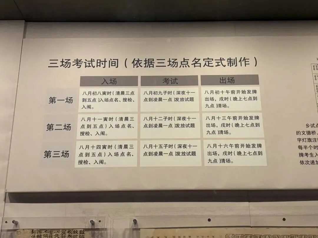 明清乡试在南京、北京以及各省省会举行。乡试期间,考生在贡院的号舍中历经九天六夜的考验与挑战,期间的辛劳更有“三场考试磨成鬼”的俗谚。乡试中举即称“举人”,中举后不仅具备了做官的资格,而且还可以使自己的社会、经济地位产生质的提升,进而成为一支重要的社会力量。因此,乡试是明清时期改变士人命运最关键的考试。下图这个为考生吃饭、睡觉、学习的地方。上面的这个板子可以取下来,玩上就可以当床了。下面为考试的时间。半夜开始准备,比当代人辛苦多了。在“西学东渐”、列强入侵,以及社会矛盾日益加深的大背景下,科举取士的弊端不断暴露,改革科举的呼声日渐强烈。然而,清廷推出的改革举措或未能全部实施,或根本未付诸实践,使科举沦为清末实现近代化、发展新式学堂的最大制度性障碍。光绪三十一年(1905),清廷被迫下诏停废科举。科举虽然在清末时已停废,但其提倡的公平竞争、择优录取。新中国长期实行的高考制度、公务员考试录用制度,及领导干部竞争上岗办法,可以视为中国古代科举合理价值在当代中国的延续。而这也值得人们思考,你想成为谁,你想走什么样的路?无论古人今人似乎都差不多似的,形式变了,本质一样。