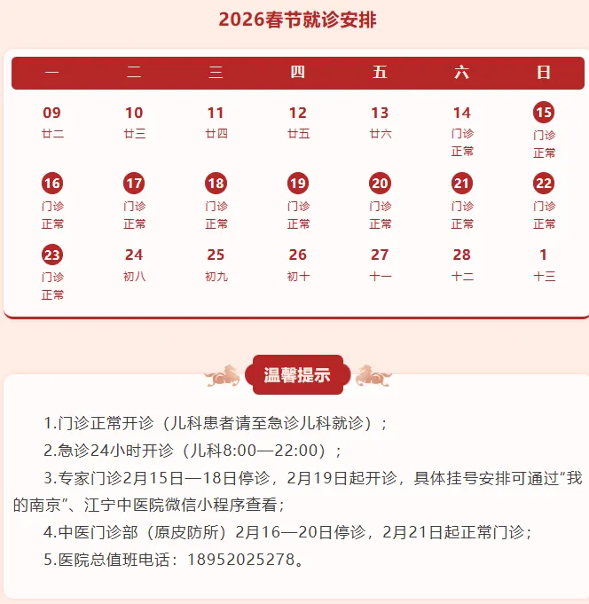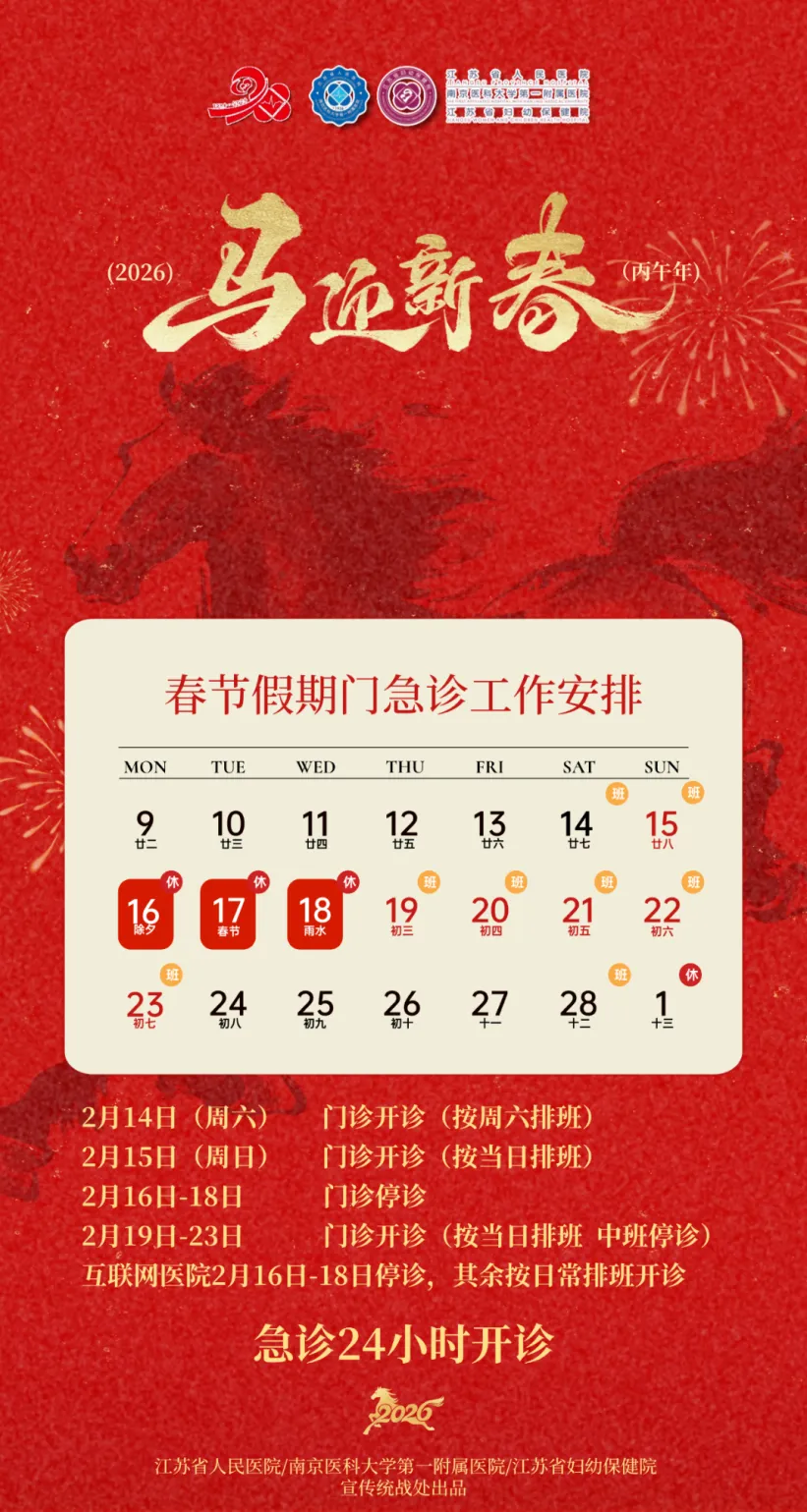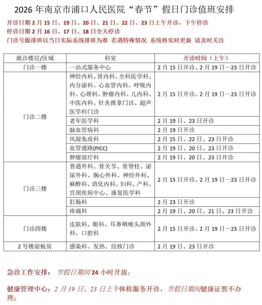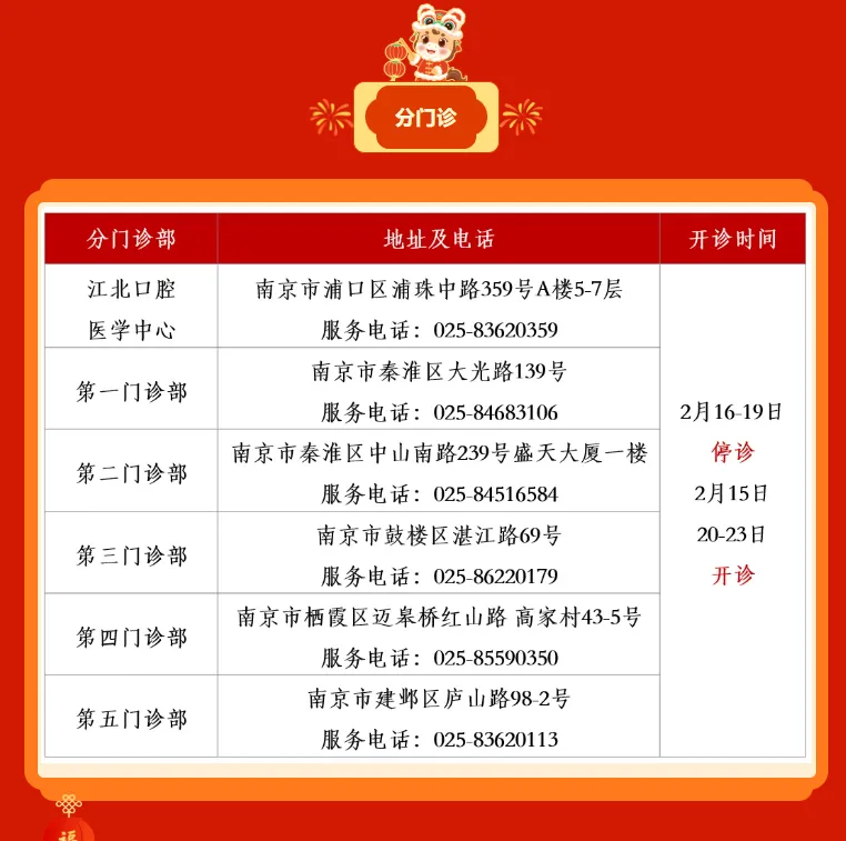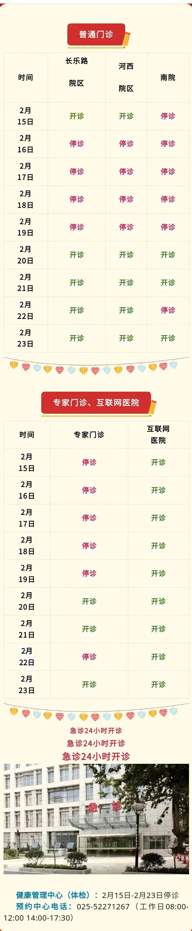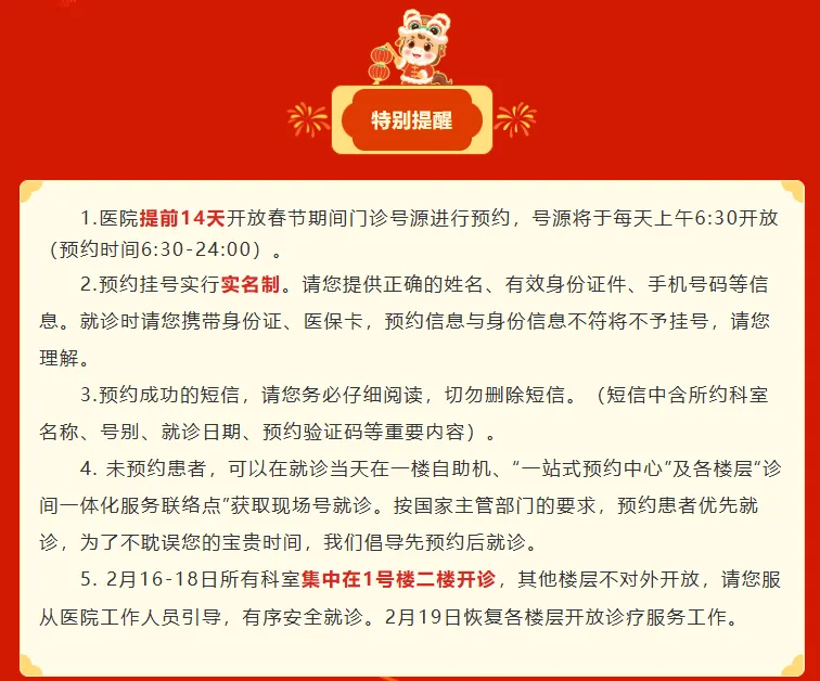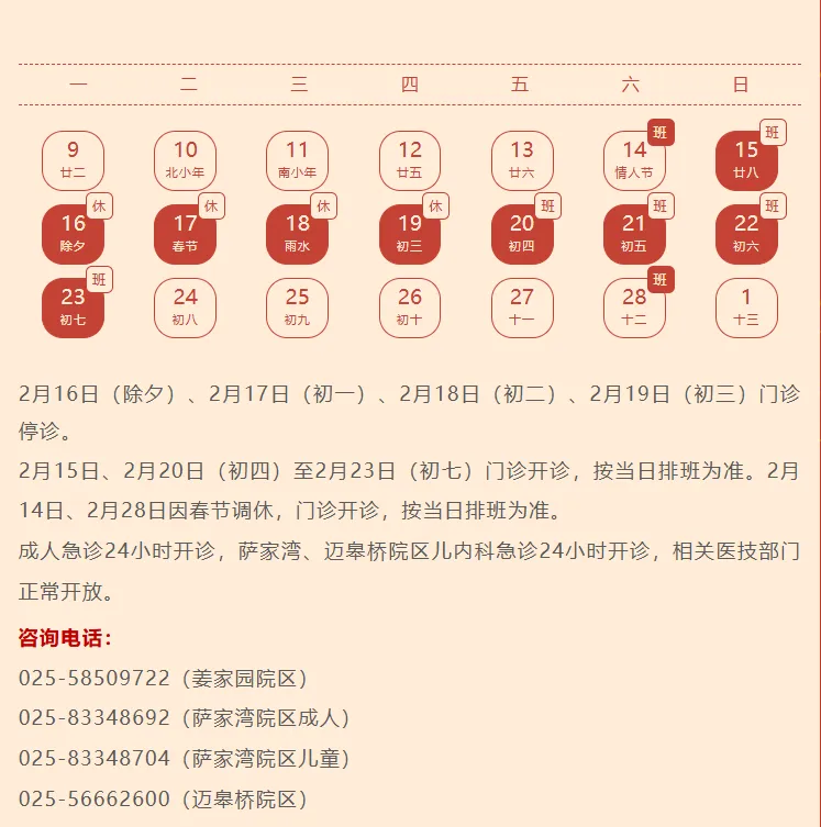 预约挂号站:2月15日—2月23日节日放假。节日期间可选择南京市妇幼保健院服务号、12320网络等预约,如有疑问请至一站式服务台咨询。