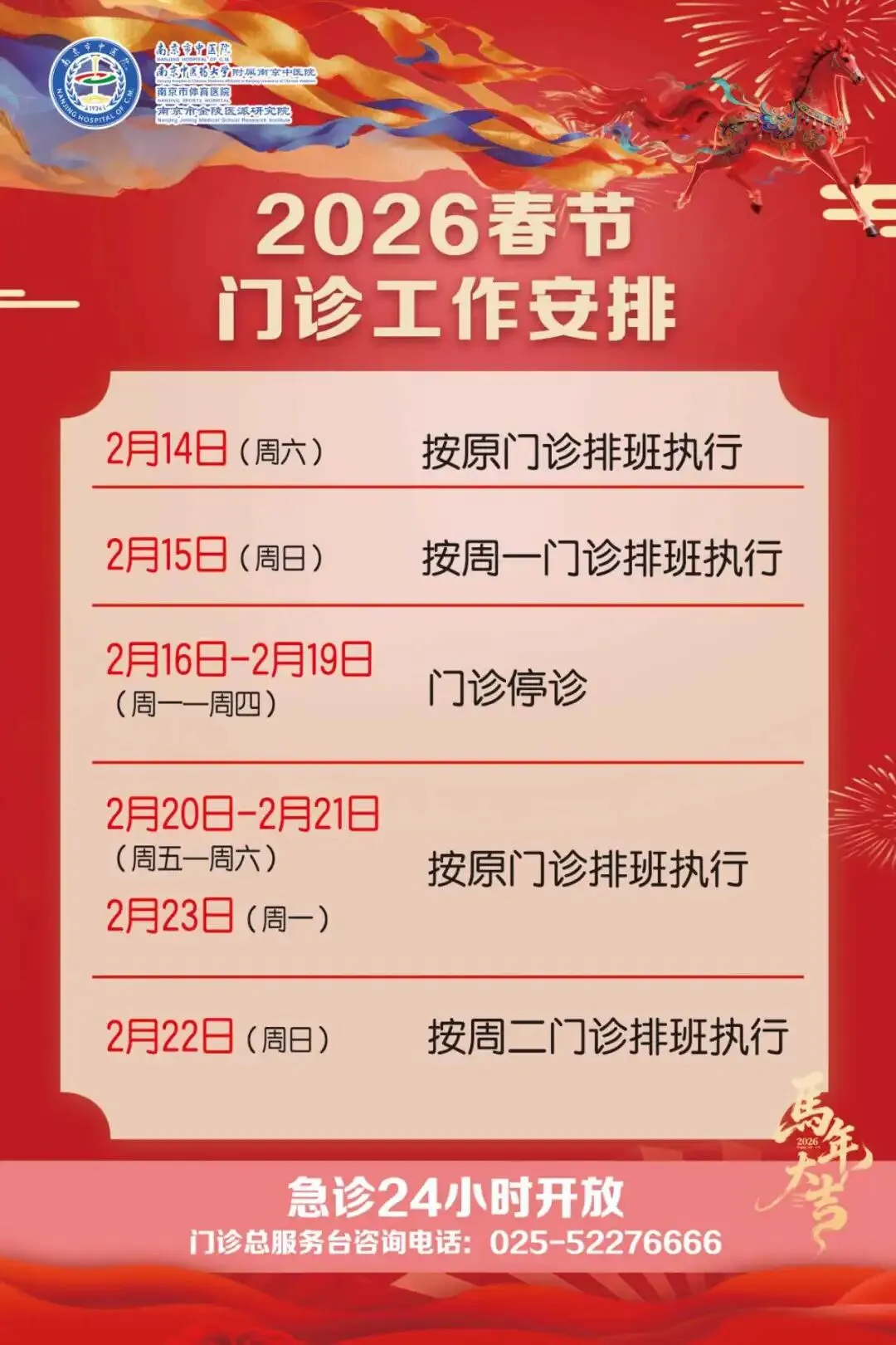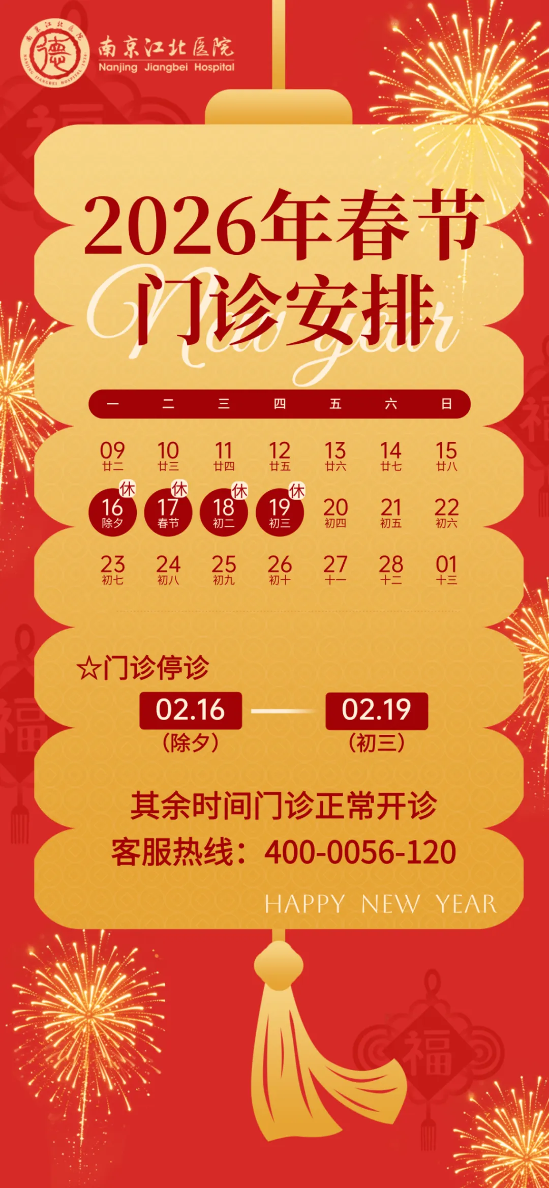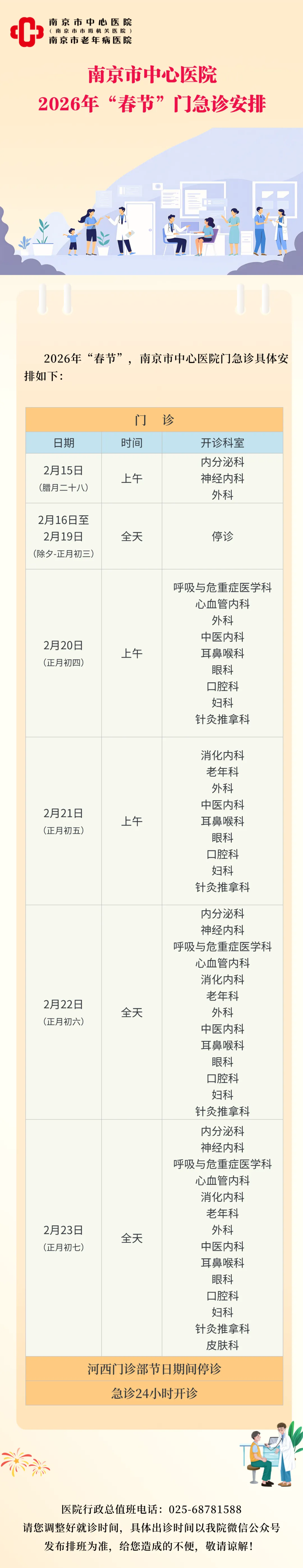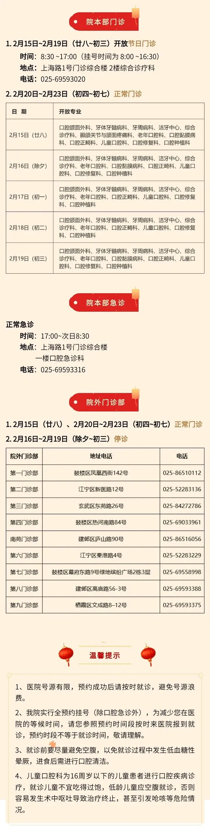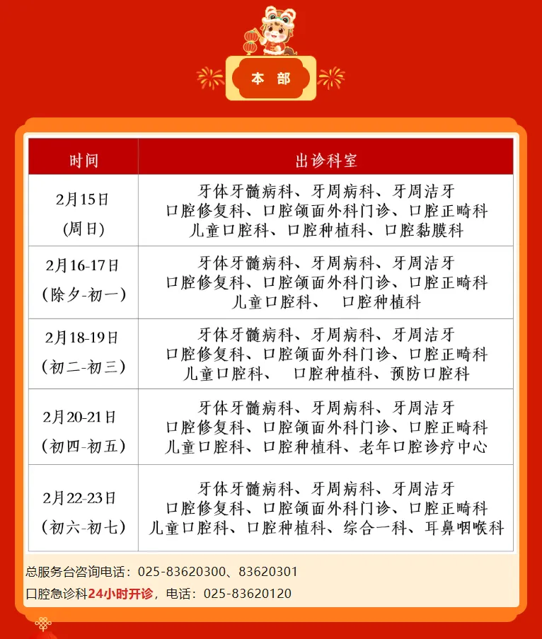 预约挂号站:2月15日—2月23日节日放假。节日期间可选择南京市妇幼保健院服务号、12320网络等预约,如有疑问请至一站式服务台咨询。