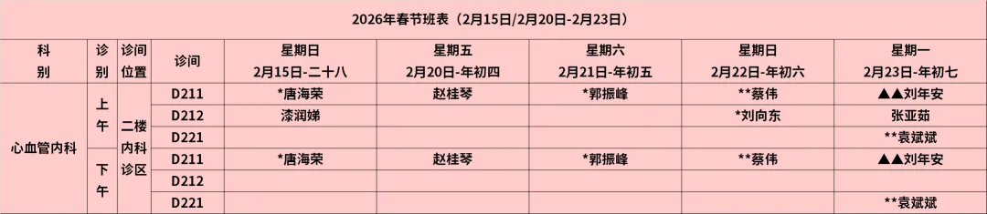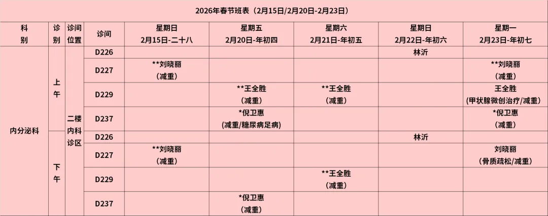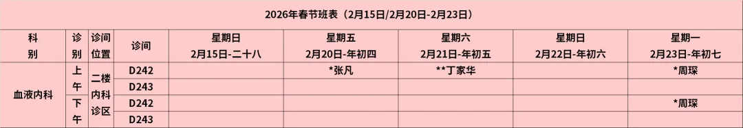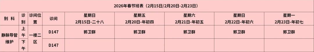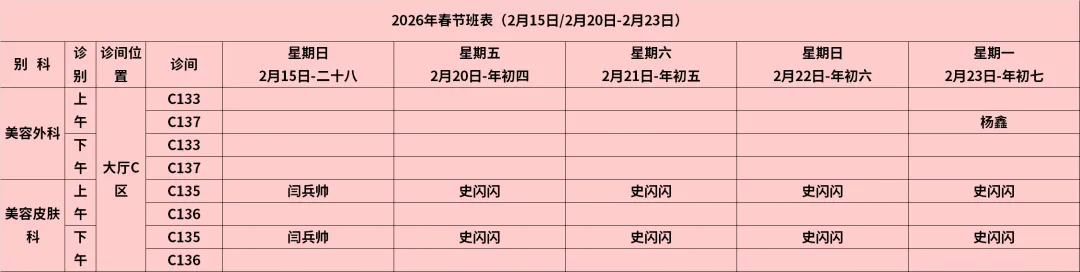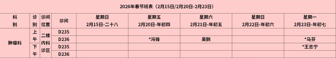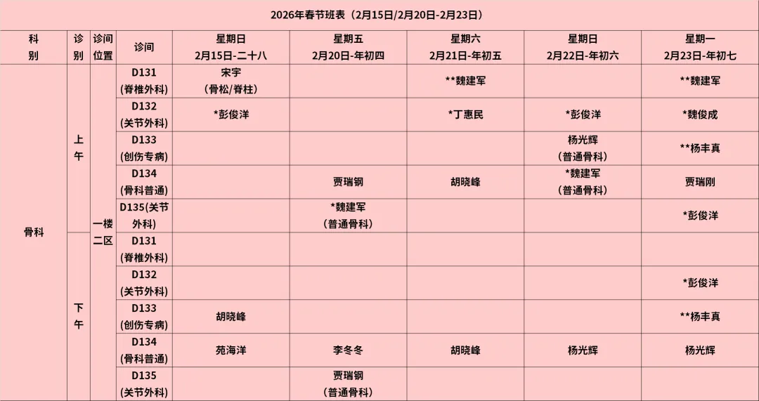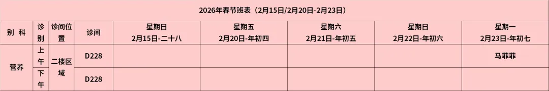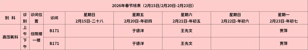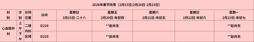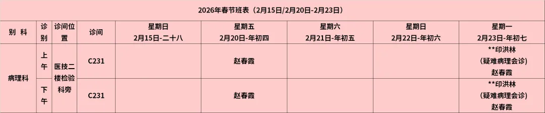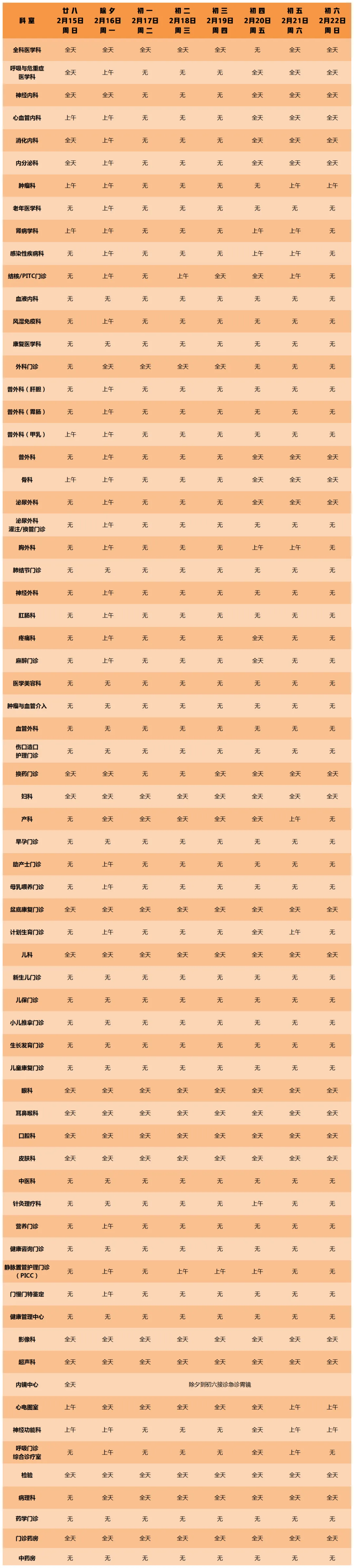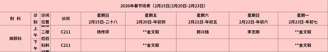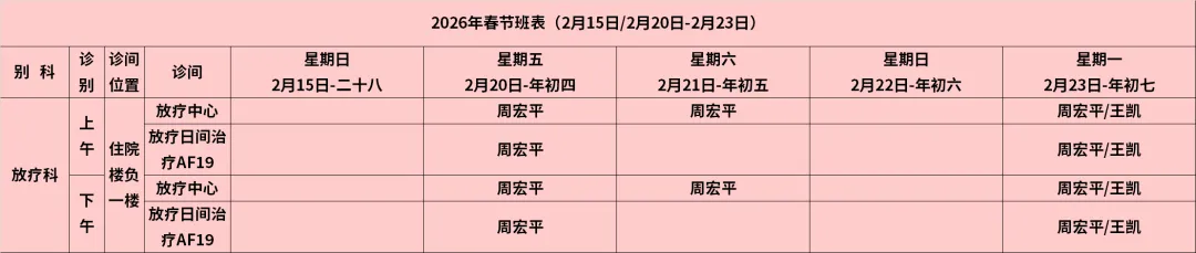 放射科:2月15日—2月23日DR拍片、骨密度检查正常值班,CT急诊备班。钼靶2月23日全天,MRI2月23日加班。