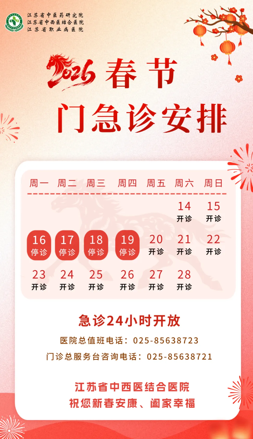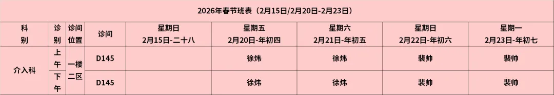 放射介入科:2月15日—2月23日节日放假。2月21日上午安排子宫输卵管造影检查(当日16:00复查,仅限提前预约患者),节假日期间开通电话预约,节假日前、后均有子宫输卵管造影检查,请提前安排好时间。预约电话13813006955(请于上午8:00-12:00,14:00-17:00期间拨打预约电话)