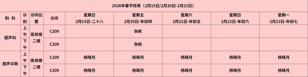 超声科:节日期间,十楼病房超声停做,急诊超声正常,门诊开诊妇科常规超声检查。2月15日至2月23日四楼超声科前台开放现场预约。