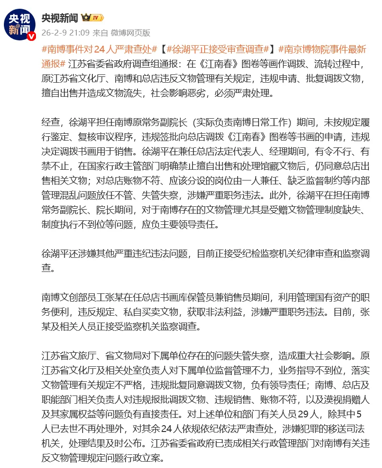 经此一事,南博前院长徐湖平、张某等24人涉嫌违法违纪,被严肃查处。