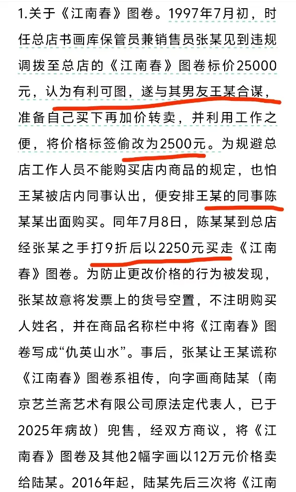 而当时,《江南春》在文物总店的标价为25000元,总店销售员张某看中其中暴利,决定据为己有。
