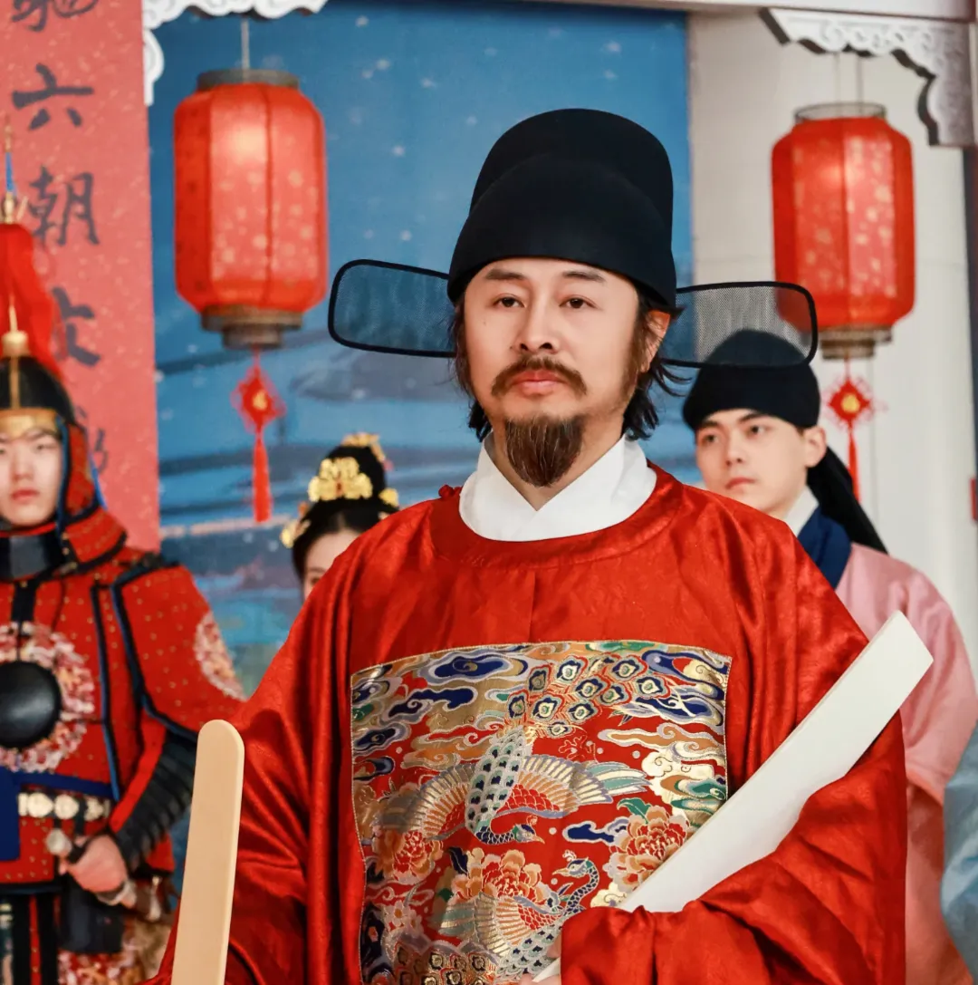 视频里最先抓住我眼球的,是一抹极其正统的大红色,那是一位身着明制官服的男子,他头戴乌纱帽,帽翅微微颤动,身上的红色圆领袍,在机场惨白的LED灯光,下显得格外庄重且鲜艳。