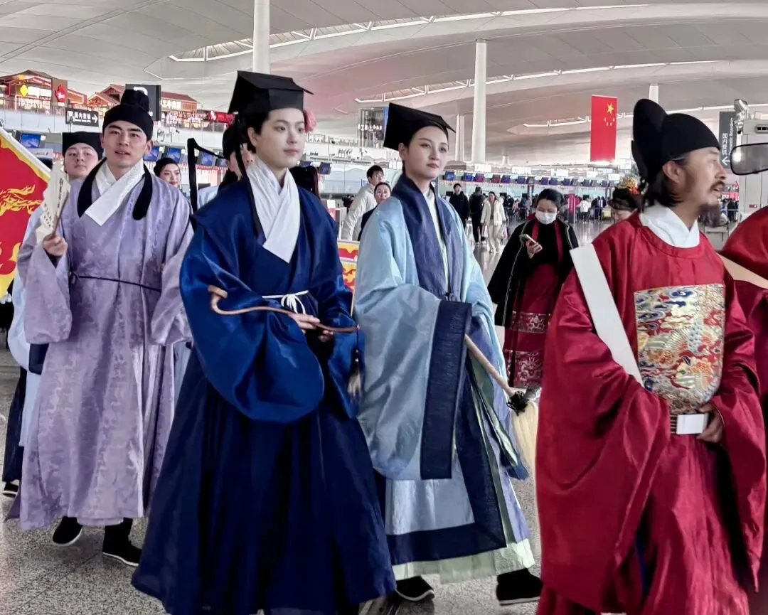 那些原本冷冰冰的金属座椅、自动扶梯和玻璃幕墙,竟然因为这些身着汉服人员的出现,而产生了一种奇妙的错位感,仿佛一脚踏进去,迎接你的不是网约车排队区,而是秦淮河畔的画舫。