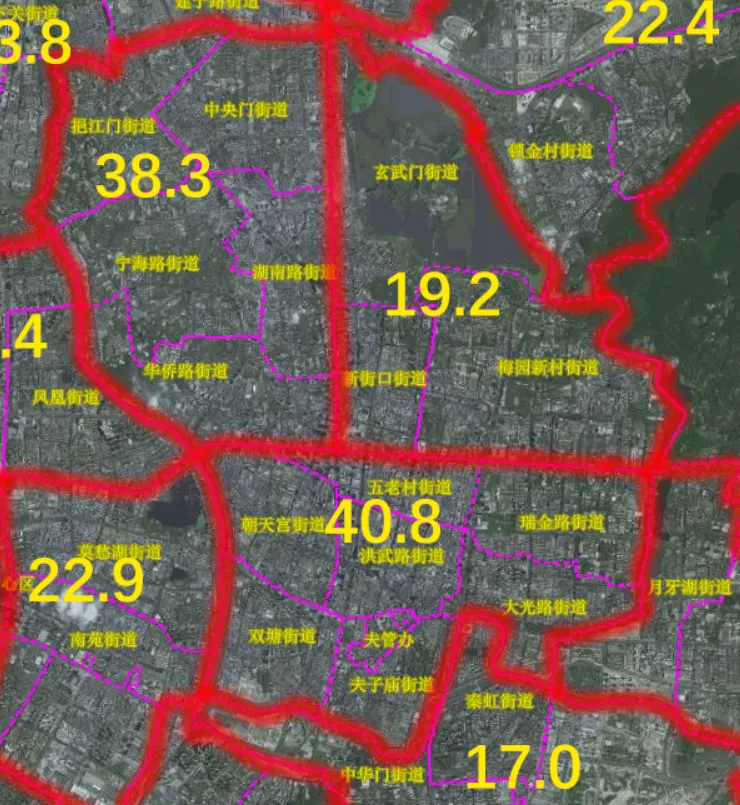 1、南京老城区一带:本文将鼓楼区、玄武区和秦淮区的城墙内的街道办事处计为老城区,其中鼓楼区部分38.3万人,玄武区部分19.2万人,秦淮区部分40.8万人,合计98.3万人,人口密度超过2.3万人/平方公里。(本文没有特殊说明使用“常住人口”口径,不考虑昼夜人口和实际人口等)此区域和老城范围略有参差,但应该影响不明显。