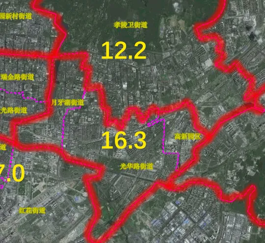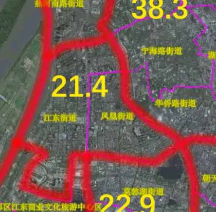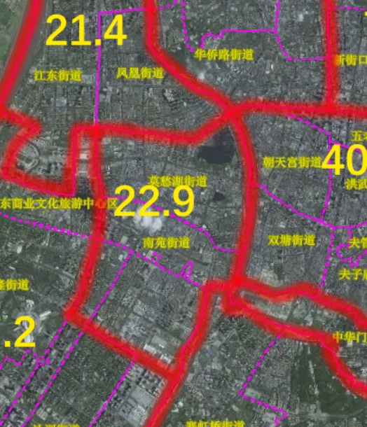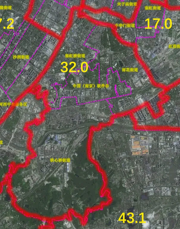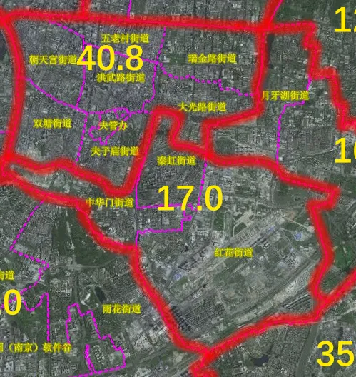 2、老秦淮外部区域:该区域3个街道,七普17.0万人。西半部是较早开发的,而红花区域城建较晚。