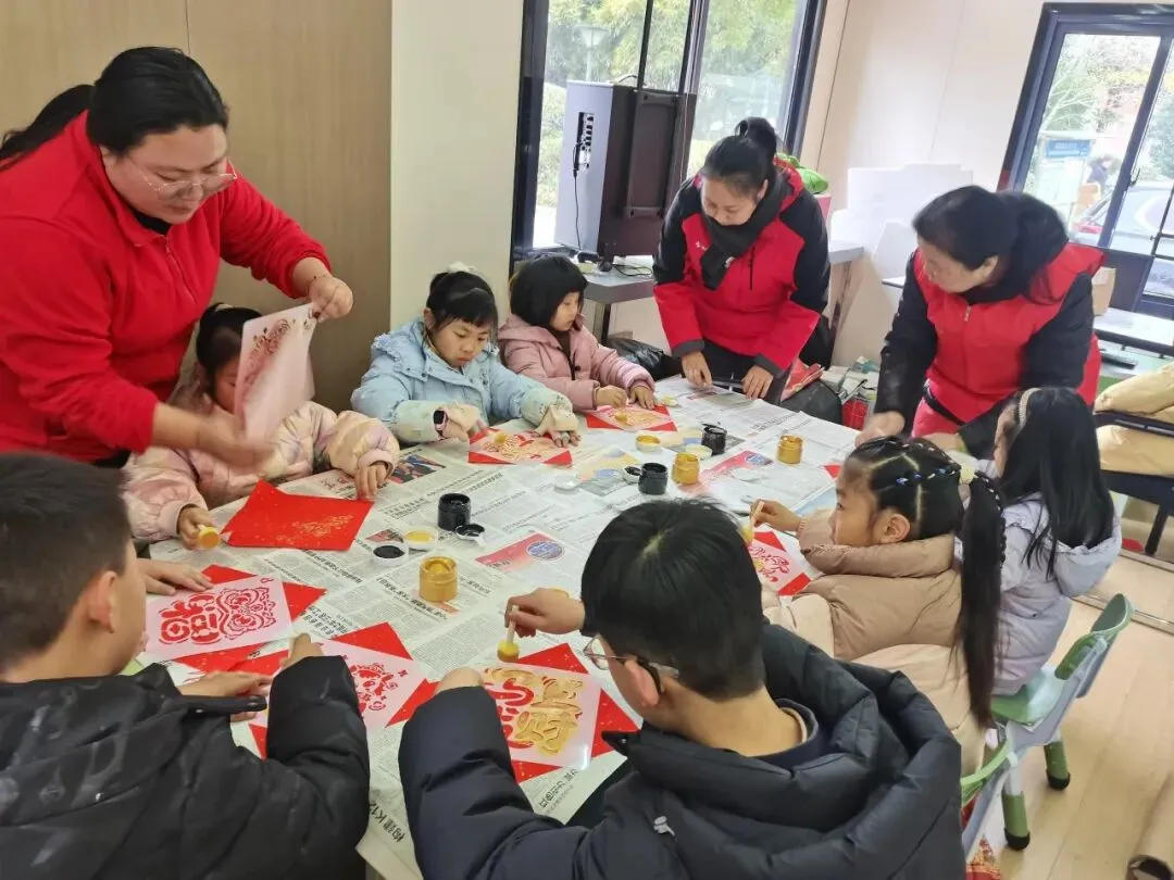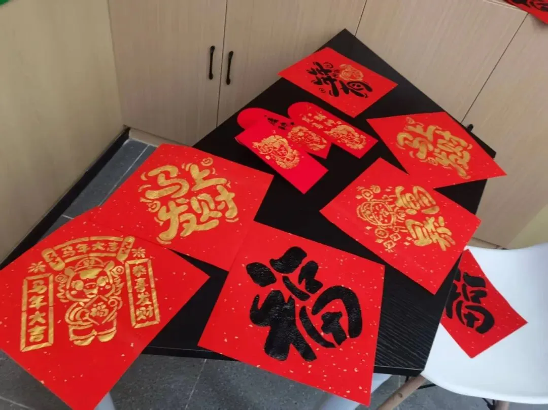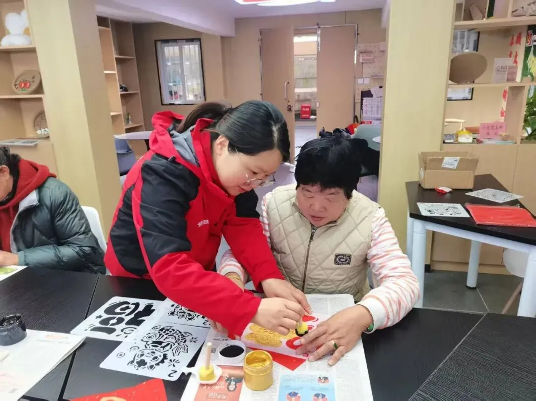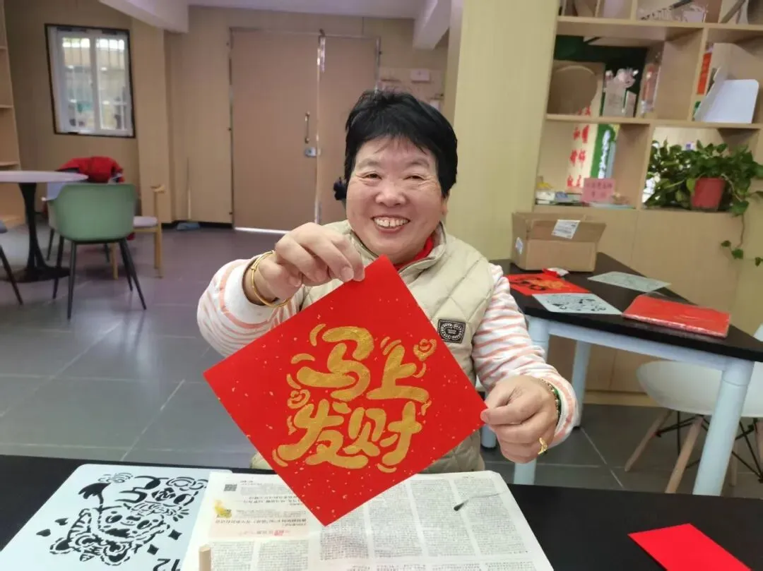 长桌上,红纸铺展,刻板静卧,金粉在晨光中泛着细碎的光。业主们围坐一圈,手握拓包,在生活顾问的指导下,亲手拓印属于自己的福字。