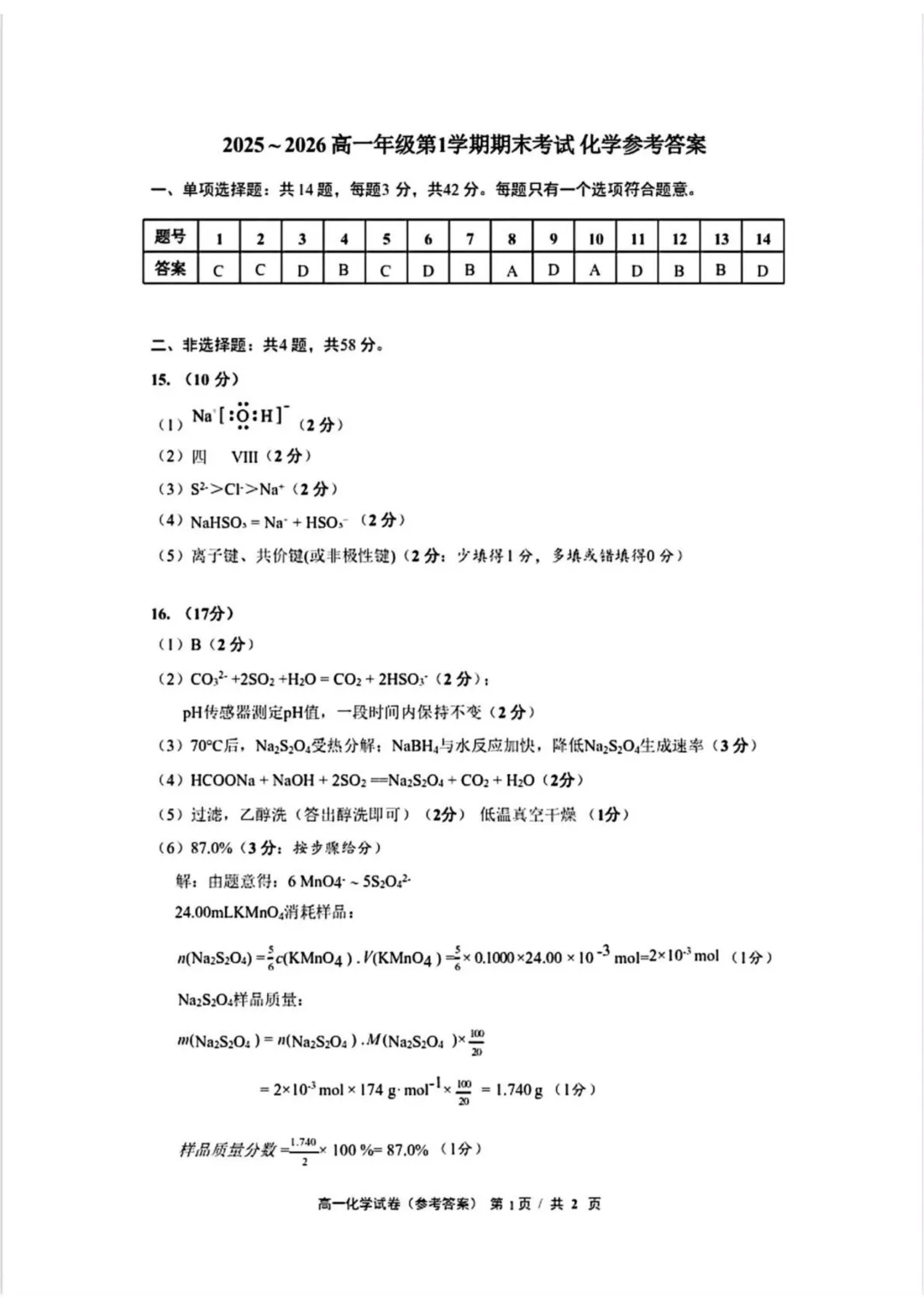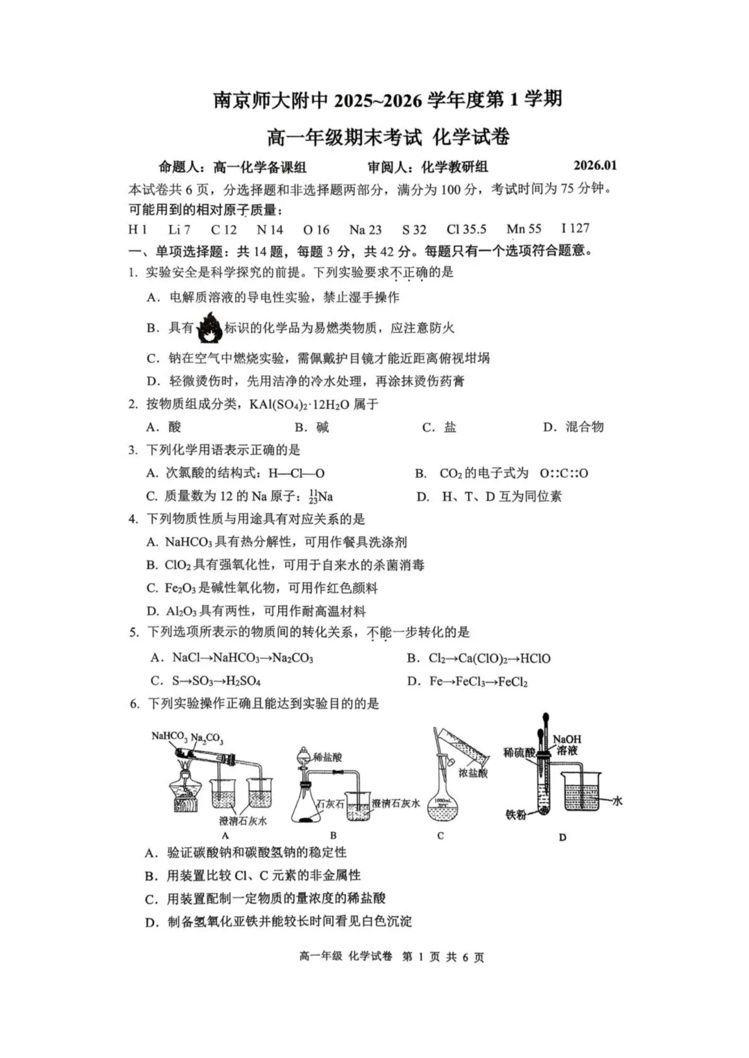 南京师大附中2025-2026学年高一上学期期末化学试题与答案,下载方式如下:
