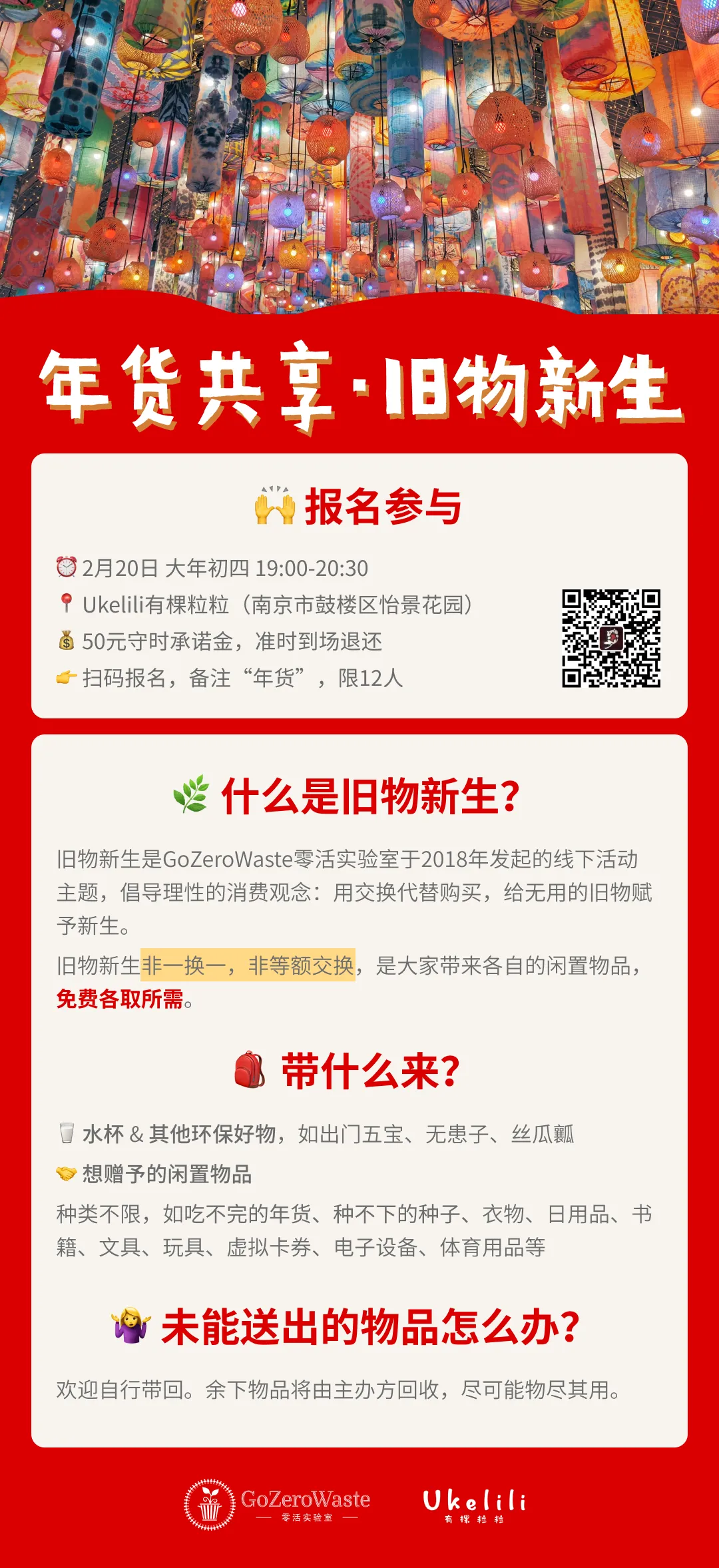 大年初四,年货共享·旧物新生专场,GoZeroWaste南京小分队在Ukelili等你——清冰箱、理杂物、换好物、接福气!