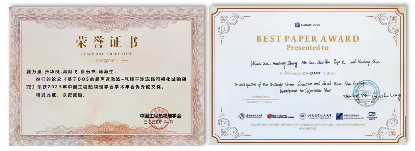 11月,获工程热物理学会学术年会优秀论文奖、CMAAE 2025国际会议最佳论文奖。