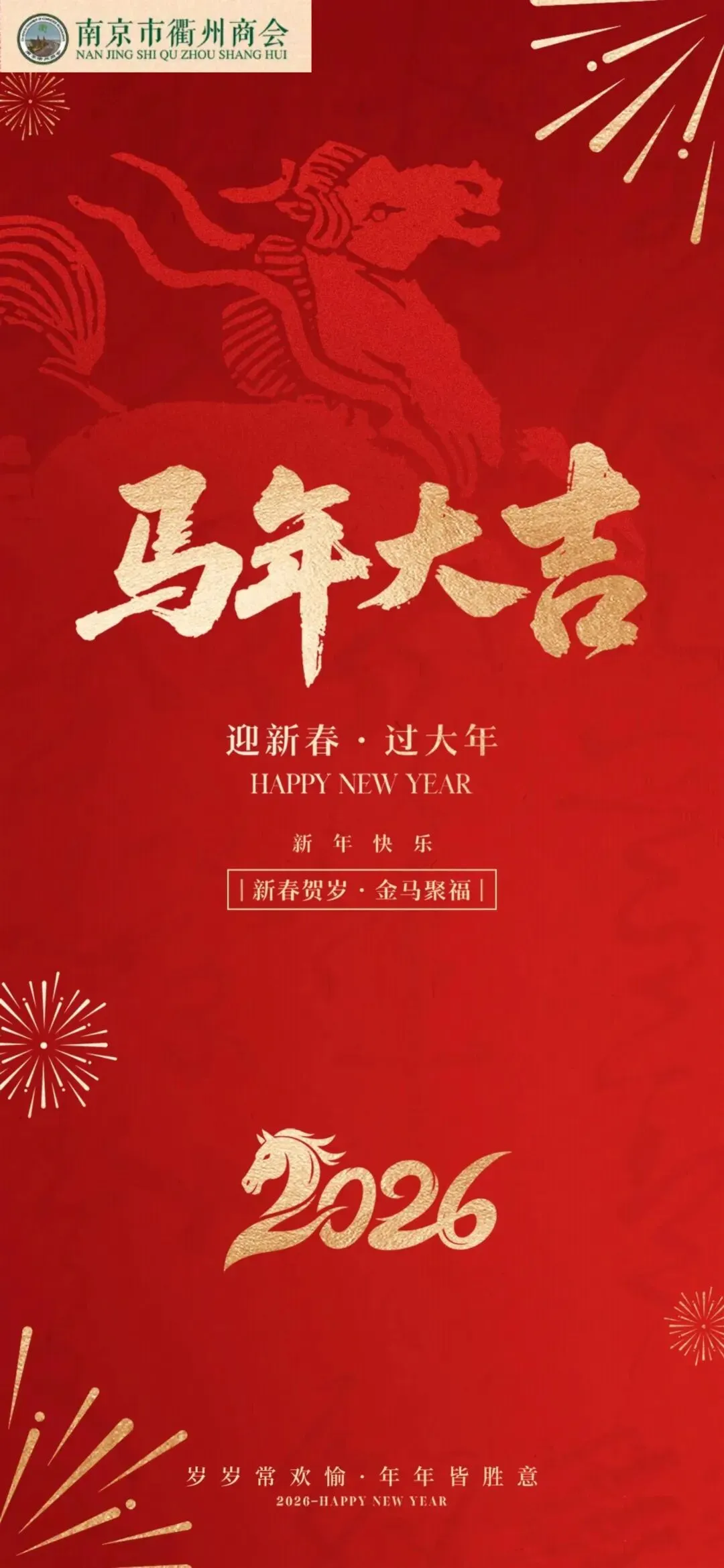 岁序常易,华章日新。值此2026丙午马年新春佳节来临之际,南京市衢州商会谨向长期以来关心支持商会发展的各级领导、各界朋友,以及全体会员企业家们,致以最诚挚的节日问候和最美好的新春祝福!回首往昔,我们策马扬鞭,携手并肩绘就发展宏图;展望未来,我们将继续秉持初心,共赴高质量发展的新征程。祝愿大家在新的一年里:龙马精神,宏图大展,阖家幸福,万事胜意!