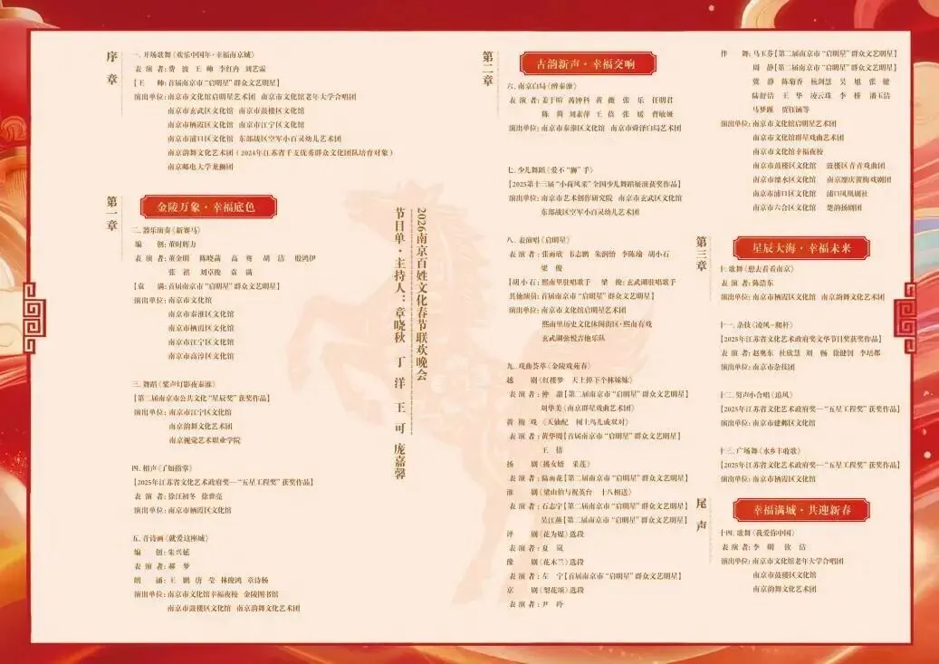 从秦淮灯影到金陵戏韵,从市井欢声到时代新声,2026南京百姓文化春节联欢晚会以文艺为笔,以真情为墨,绘就了一幅生动饱满的“南京春节图鉴”。这不仅是一场晚会,更是一份献给所有南京人与热爱南京的人的新春礼物。